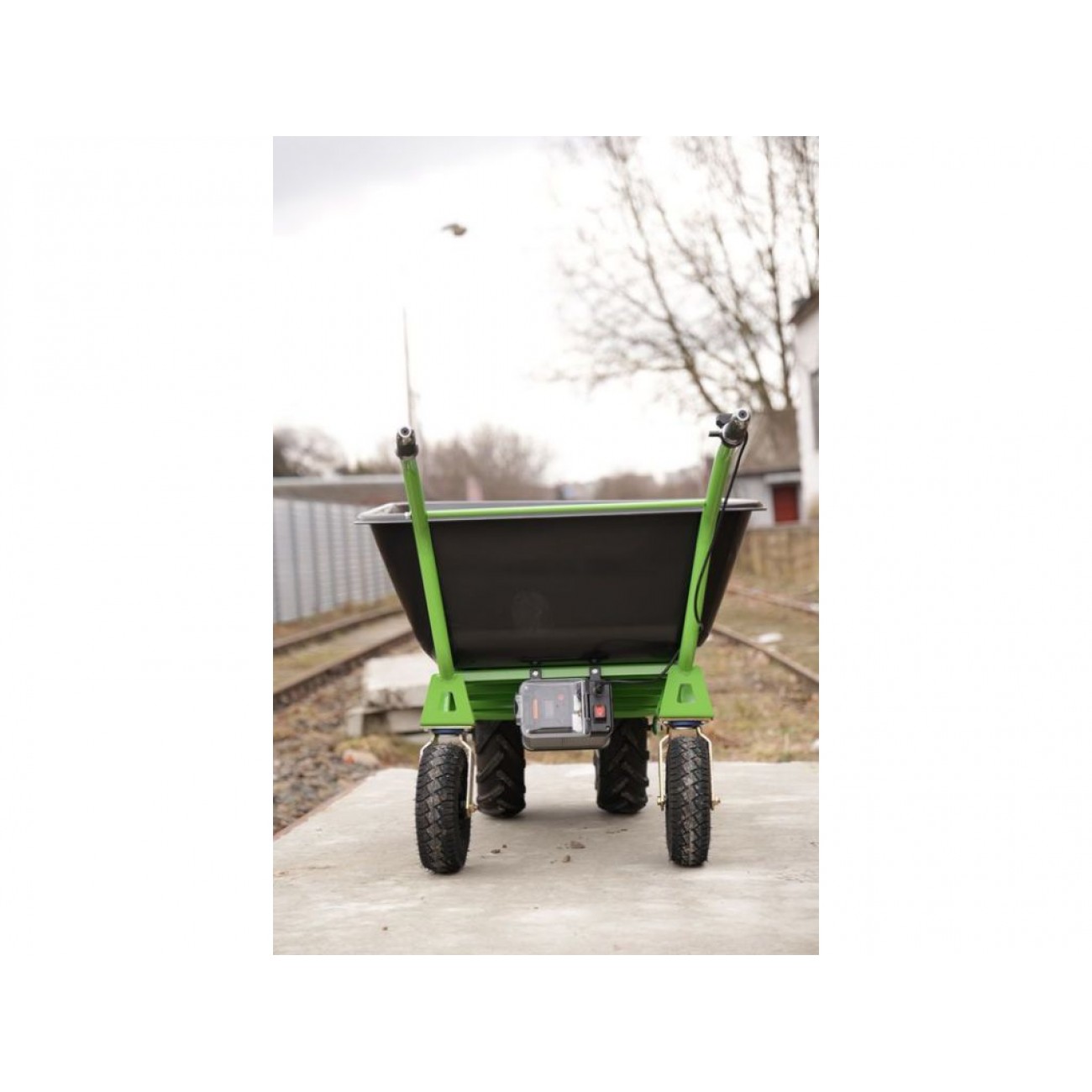 Ведуче колесо/колеса такої тачки має електропривід, який живиться від акумулятора. Це забезпечує рух тачки без докладання фізичних зусиль.