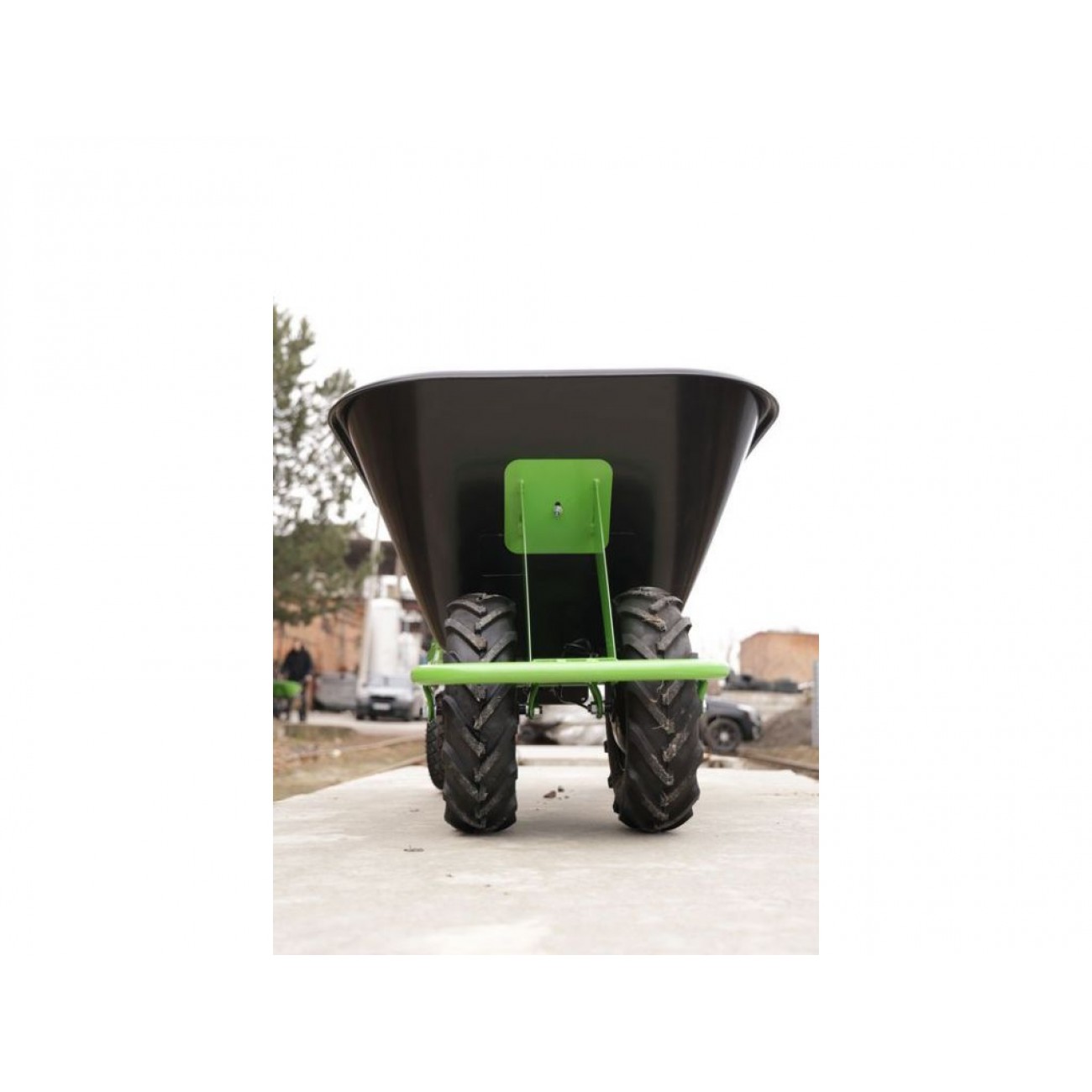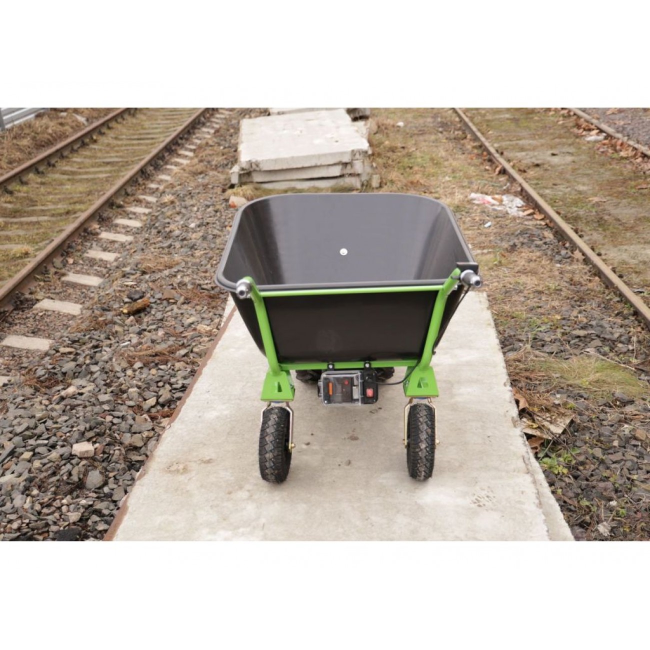 Час безперервної роботи - до 4 годин, час заряджання - 3 години. Здійснює передній і задній хід, елемент керування розташований на правій ручці. Кузов об’ємом 160 л виготовлений з автомобільного HDPE-пластику, повністю герметичний і стійкий до агресивних хімічних речовин. Матеріал кузова біологічно інертний, що дозволяє застосовувати тачку для транспортування харчових продуктів.