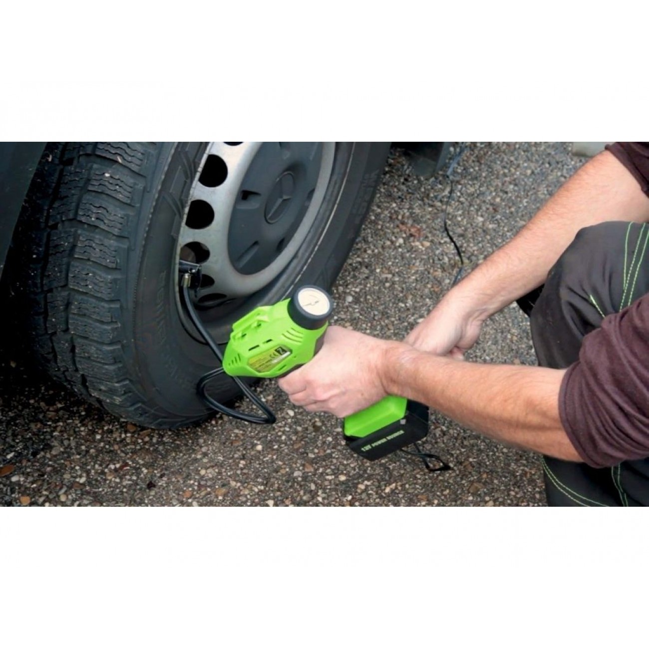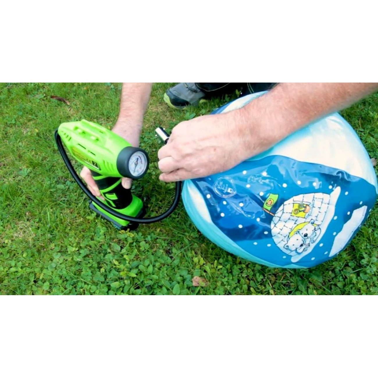 Компресор забезпечує максимальний тиск 6,8 Бар, для контролю тиску є манометр. Гнучкий шланг довжиною 50 см і 3 адаптери (для м'ячів, для велосипедних шин та конічний адаптер) забезпечують зручну і легку експлуатацію. Пристрій може безперервно працювати до 5 хвилин, після чого потрібна зупинка для охолодження. Компактний розмір і вага близько 2 кг дозволяють брати цей портативний компресор на акумуляторі з собою в дорогу і зберігати його в багажнику автомобіля.