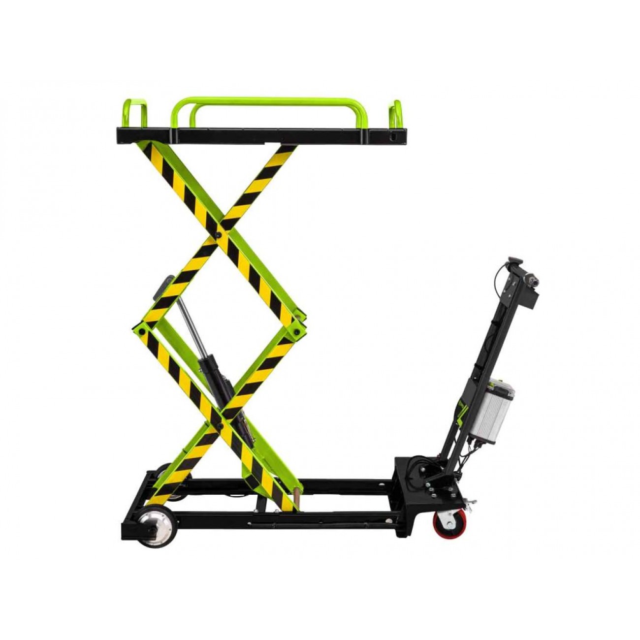 Електродвигун, що живиться від акумулятора, подає тиск у гідроциліндри, які розсувають ножичні важелі. При розширенні візок піднімає вантаж, при складанні – опускає.