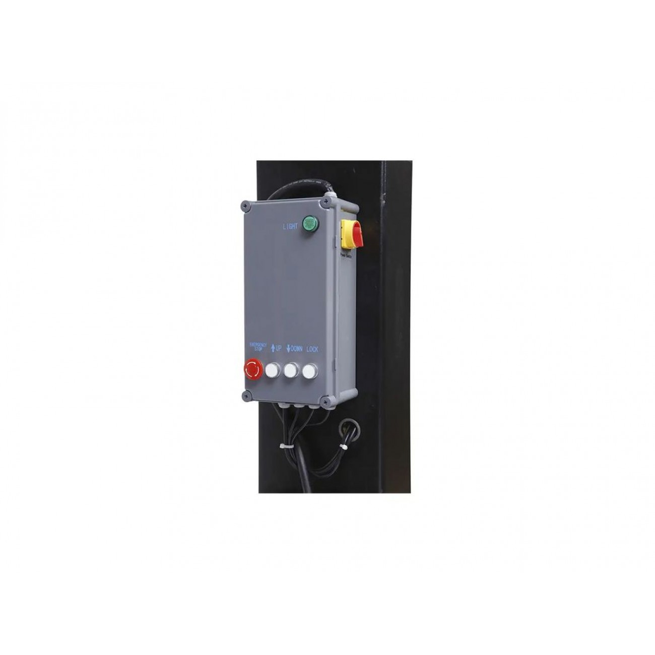 Підйомник працює від електродвигуна потужністю 2,2 кВт з живленням від напруги 230 В. Управління здійснюється з панелі з 3 кнопками (підйом, опускання, опускання в нижнє положення). Автоматичне замикання запобіжних засувок і розблокування стопорів натисканням кнопки спрощують експлуатацію і роблять її безпечнішою. 4 регульовані телескопічні лапи дозволяють адаптувати цей двостійковий підйомник для СТО до різних опорних точок і розмірів автомобілів.