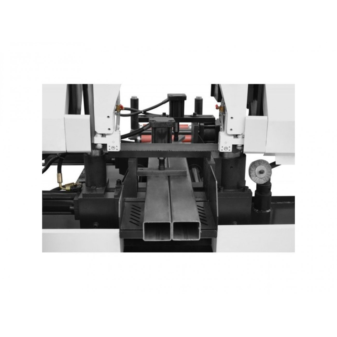 На стрічково-пильному верстаті встановлені подвійні лещата, одні використовуються для затискання при розпилюванні, другі для подачі заготовки на заданий розмір. Довжина подачі контролюється ультрафіолетовим датчиком руху, який контролює нульову точку та величину переміщення заготовки.