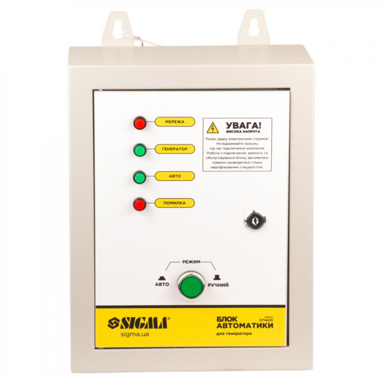 Блок автоматики 220В для інверторних генераторів до 10кВт SIGMA (5714031) застосовується для спільної роботи з генераторами, які мають опцію автоматичної роботи і винесений на передню панель роз’єм для підключення блоку автоматики. Блок забезпечує автоматичний запуск генератора у разі збою або припинення подачі електроенергії у спільній мережі, перемикання навантаження на живлення від генератора, а також зворотне перемикання навантаження на загальну мережу при відновленні та зупинці генератора. Блок автоматики зібраний у металевому корпусі, із кріпленням на стіну (всередині приміщення). З’єднання з генератором відбувається за допомогою спеціального кабелю управління (у комплекті) та силового дроту (придбається окремо). Монтувати блок автоматики необхідно у сухому, захищеному від атмосферних впливів приміщенні.