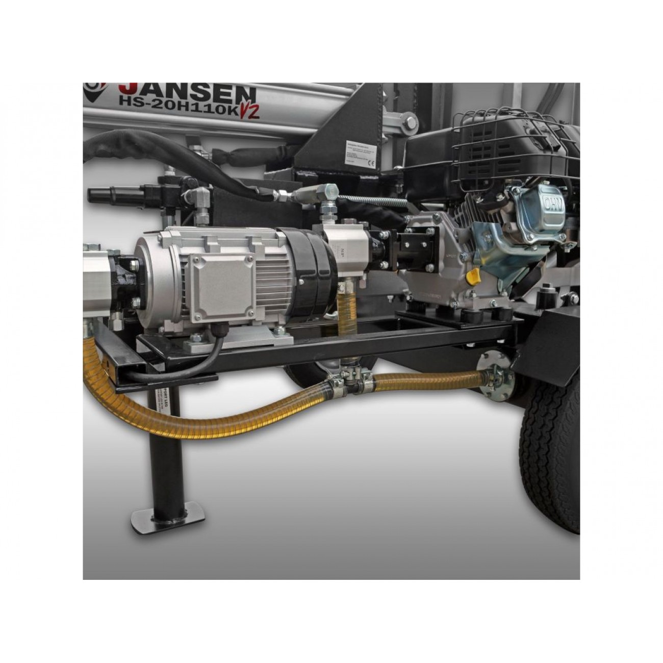 Однією з видатних особливостей Jansen HS-20H110K-V2 є можливість вибору з двох різних типів приводів. Потужний бензиновий двигун KOHLER дозволяє використовувати дровокол у віддалених районах без доступу до електроенергії, тоді як 400-вольтний електродвигун потужністю 2,2 кВт пропонує екологічно чистий, тихий варіант для використання в житлових районах. Ця гнучкість робить Jansen HS-20H110K-V2 надзвичайно універсальним.