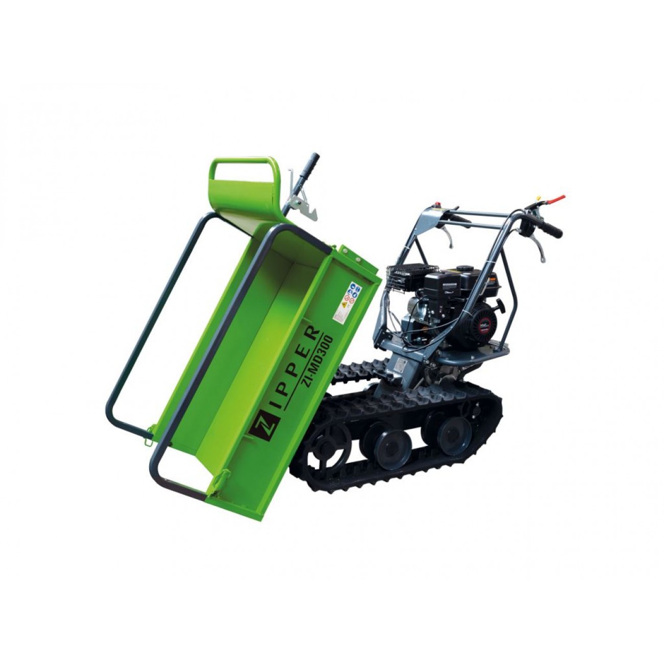 Думпер гусеничний, міні самоскид Zipper ZI-MD300 призначений для перевезення сипучих матеріалів по різних місцевостях. Відмінно впорається з транспортуванням піску, гравію, каменю, будівельного і побутового сміття вагою до 300 кг. Завдяки компактній конструкції без проблем проїжджає по вузьких доріжках і у невеликі ворота. Обладнаний бензиновим двигуном потужністю 4,1 кВт.
