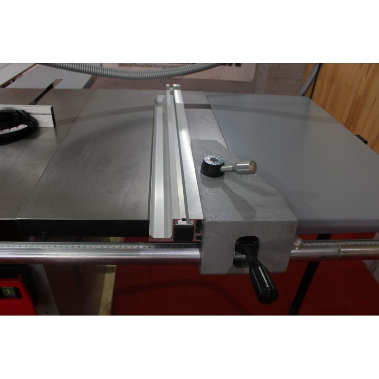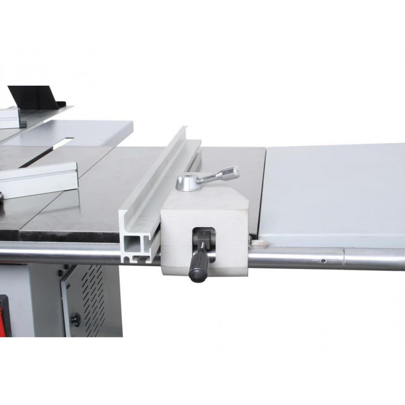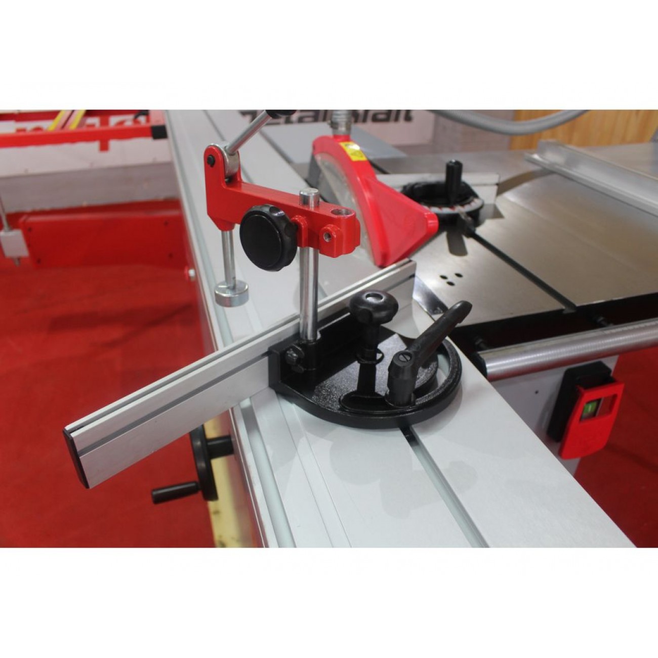 Телескопічна упорна лінійка Телескопічна упорна лінійка зліва дозволяє різати матеріал шириною до 1220 мм, має можливість повороту на заданий кут для виконання косого різу, а також можливість перестановки на столі каретки для різу до упору спереду і від упору ззаду заготовки. |