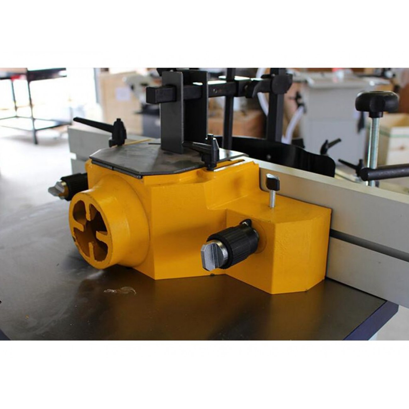 Висувний шпиндель 30 мм обертається зі швидкістю 6500 об / хв, у верхній частині корпусу знаходиться механізм, який підрізає опрацьований матеріал. Верстат ідеальний, як для професіоналів, так і столярів аматорів.