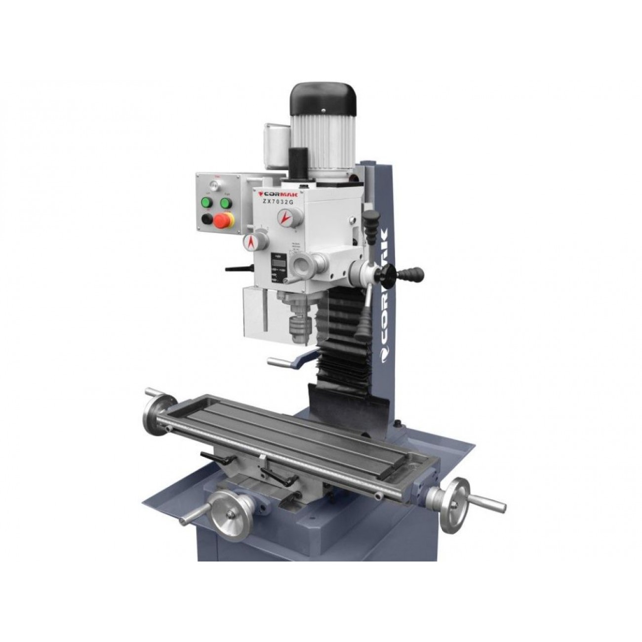 Фрезерний верстат Cormak ZX7032G можна використовувати для свердління, розгортання та розширення отворів до 32 мм у чавуні та нарізування різьблення отворів до М12, фрезерування до ширини 80 мм та фальця до 22 мм. Він також підходить для різання та торцевого фрезерування.