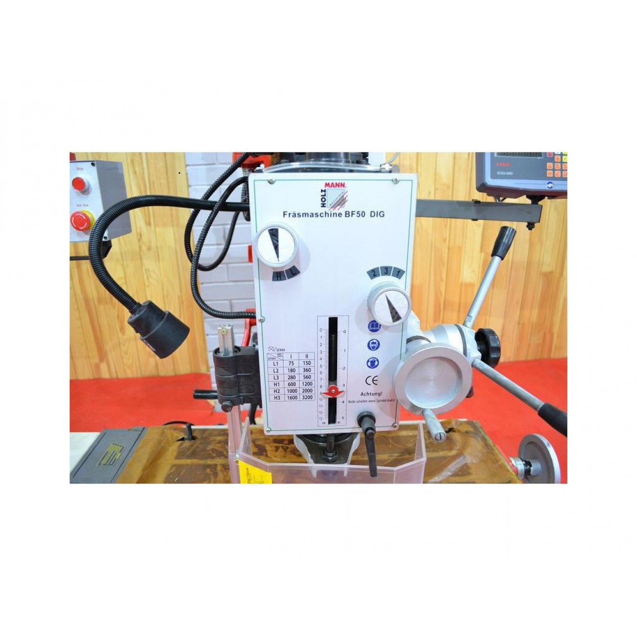 Фрезерний верстат Holzmann BF 50DIG - це професійне обладнання для обробки металу, яке застосовується для фрезерування, свердління, розгортання, зенкерування, нарізання різьби та ряду інших робіт. Оснащений витривалим 2-ступінчастим двигуном з 12-ступеневим регулюванням швидкості у 2 діапазонах - 75-1600 об/хв і 150-3200 об/хв. Легке переналаштування з горизонтальної роботи на вертикальну і навпаки, а також поворот вертикальної фрезерної головки від -90° до +90° дозволяють якісно виконувати завдання різної складності. Цифрова індикація по 3 осях підвищує точність обробки.