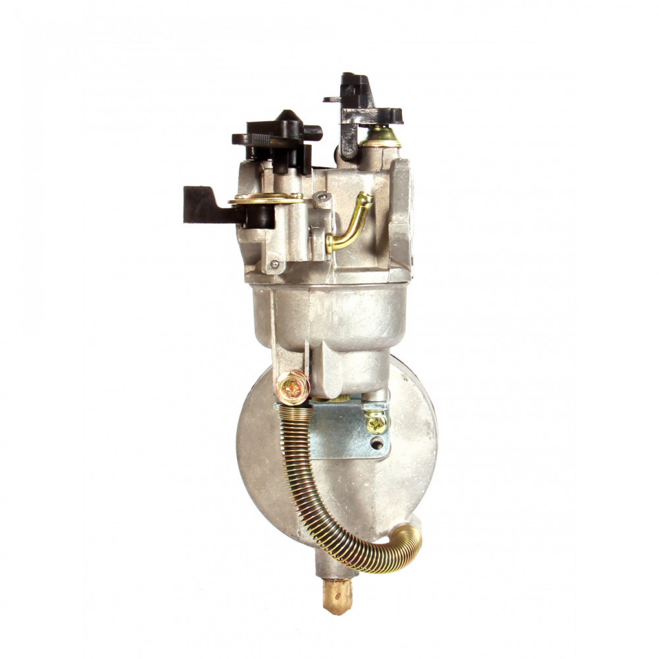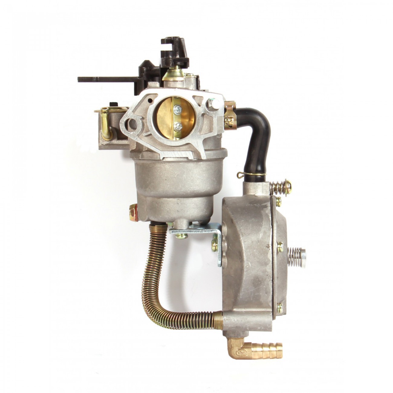 - Видоизмененный карбюратор для бензинового двигателя генератора, который технически доработан для возможности подключения к нему и БЕНЗИНОВОГО ТОПЛИВА и ГАЗОВОЙ МАГИСТРАЛИ. При этом на корпусе карбюратора размещен топливный кран, как это и предполагает изначальная конструкция карбюратора в заводском исполнении на ДВС подобного типа;
