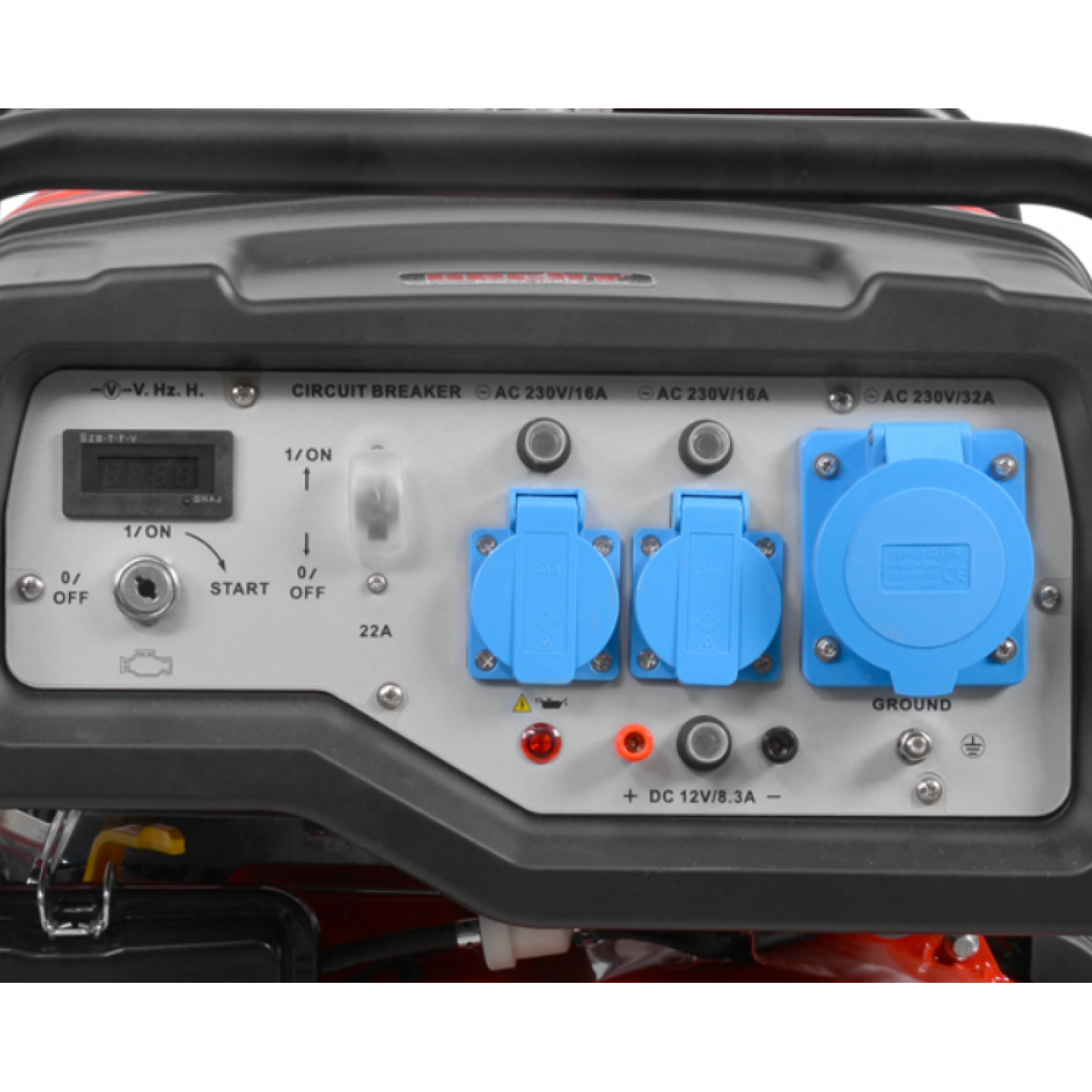На головній панелі управління розташований цифровий дисплей для перевірки згенерованої напруги (вольтметр), попереджувального світла рівня масла, вимикачів всіх розеток і затиску для заземлення напруги. На лівій стороні панелі розміщуються три розетки. Перша і друга розетки є стандартними 230В/50Гц (16А), а наступні - промисловими однофазними розетками 230В/ 50Гц (32А). Ця розетка призначена для підключення всіх приладів або електромереж напругою понад 16А. Генератор придатний для використання в якості аварійного блоку живлення, або блоку живлення для мобільних сервісних центрів. Під основними розетками розміщений клем 12В постійного струму з окремим контуром гальма. Максимальна напруга - 8,3А. Цей термінал можна використовувати для живлення деяких 12В приладів або для зарядки деяких 12В акумуляторів. Однак він не обладнаний змінної зарядкою, тому потрібно постійно перевіряти рівень зарядки акумулятора і своєчасно відключати його.