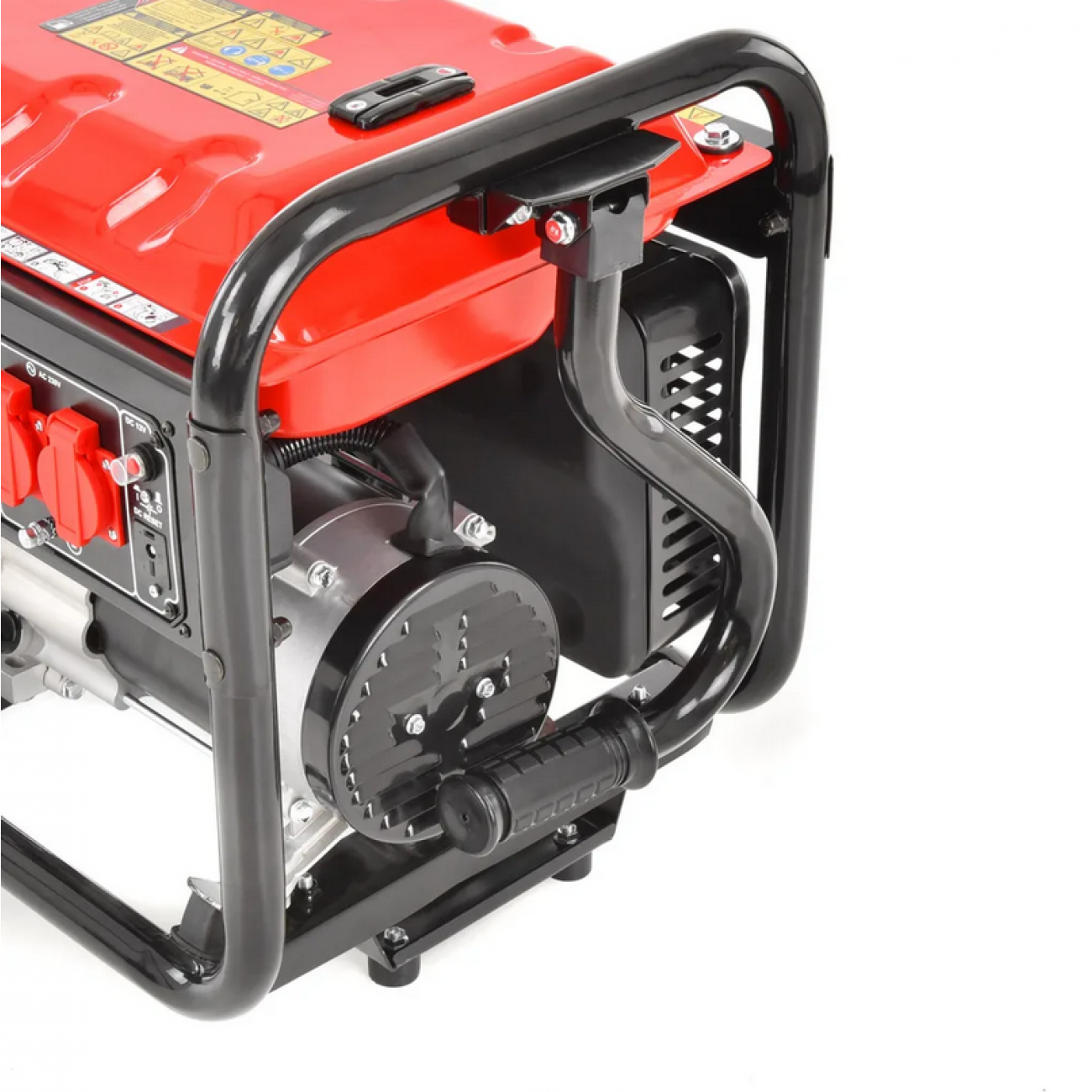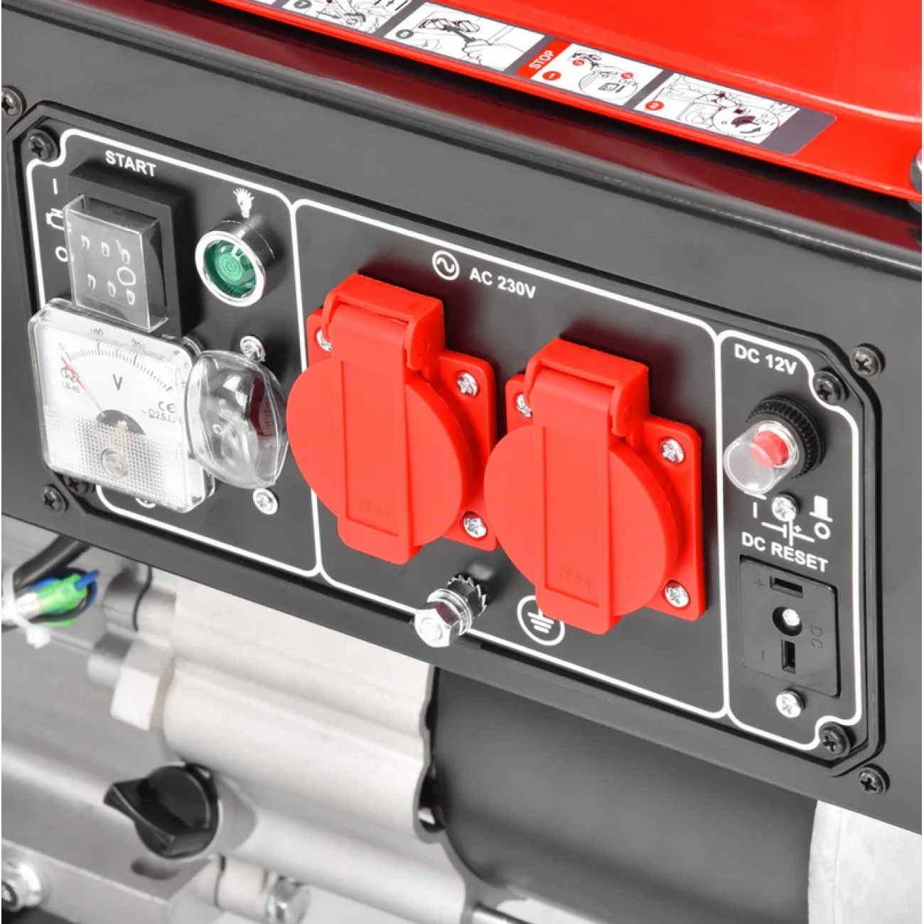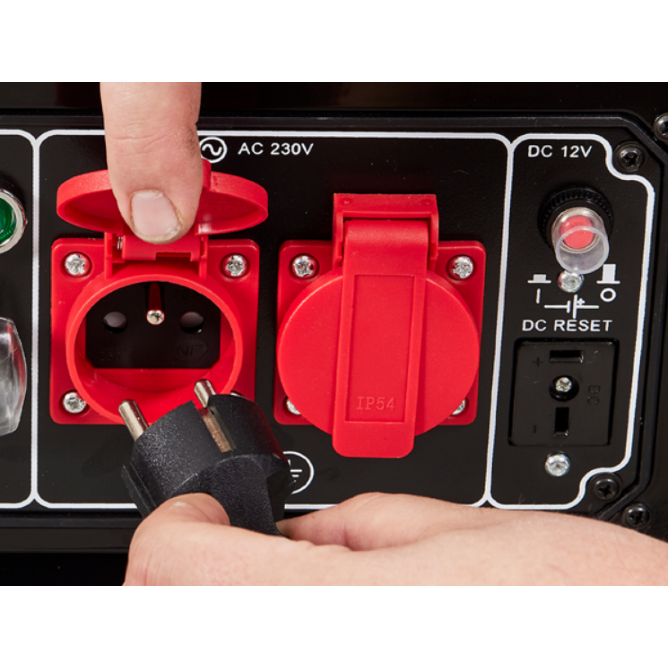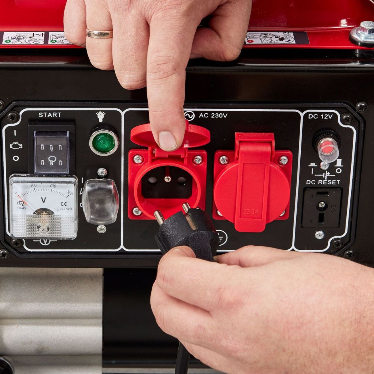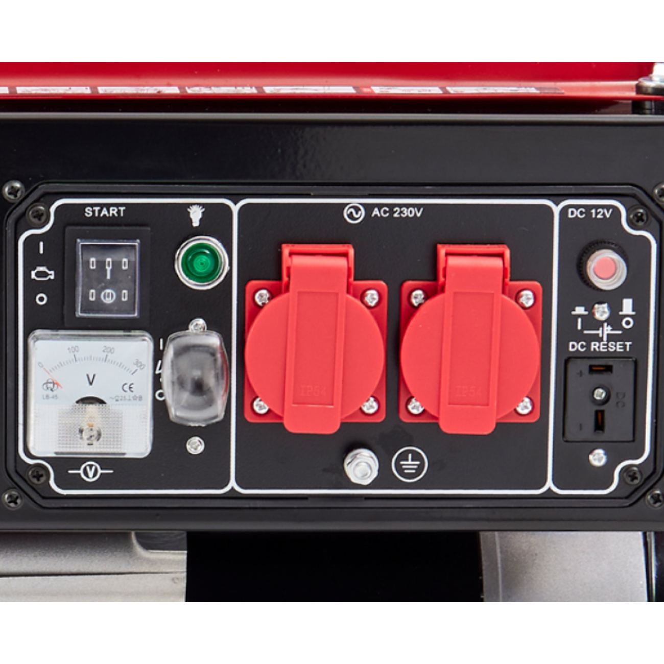 Зрозуміла панель керування На електрощитку генератора є контрольний аналоговий вольтметр, пара класичних розеток 2x розетка 230В - 16А, 1x розетка 12В для підключення приладів 230 В/50 Гц, серед яких є і захисна клема для підключення заземлювального кабелю.