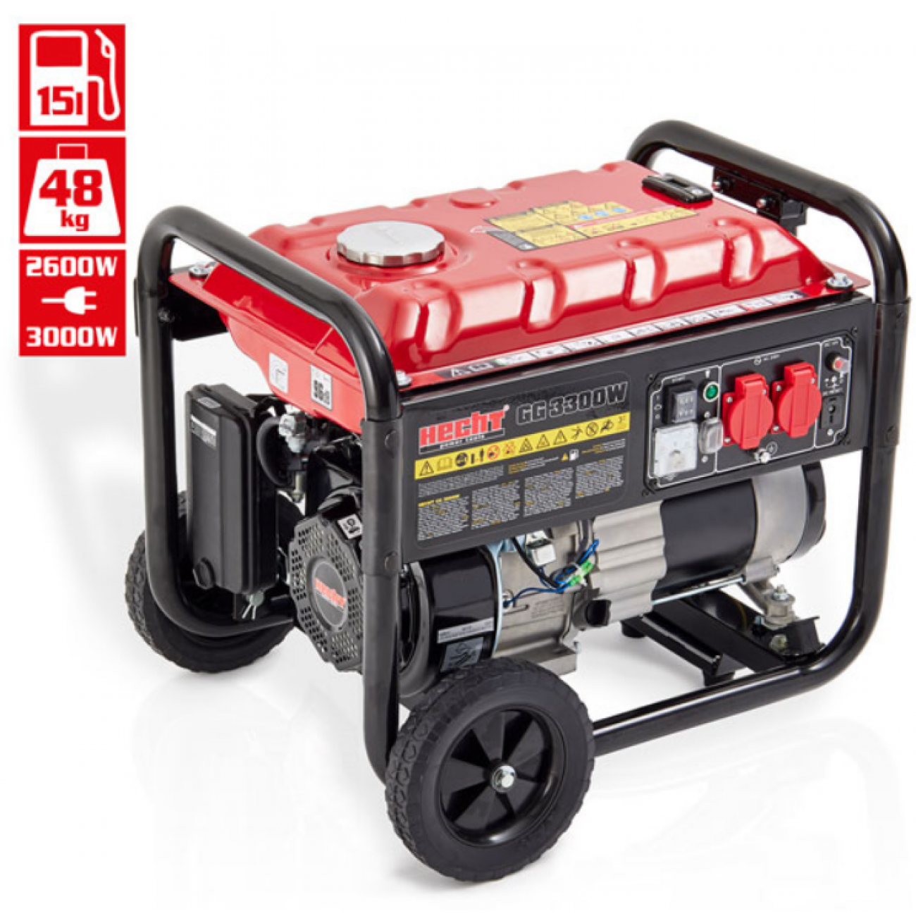 HECHT GG 3300W – це середній бензиновий електрогенератор, що працює від чотиритактного двигуна об'ємом 208 см3. Силова установка має паливний бак об'ємом 15 л.
