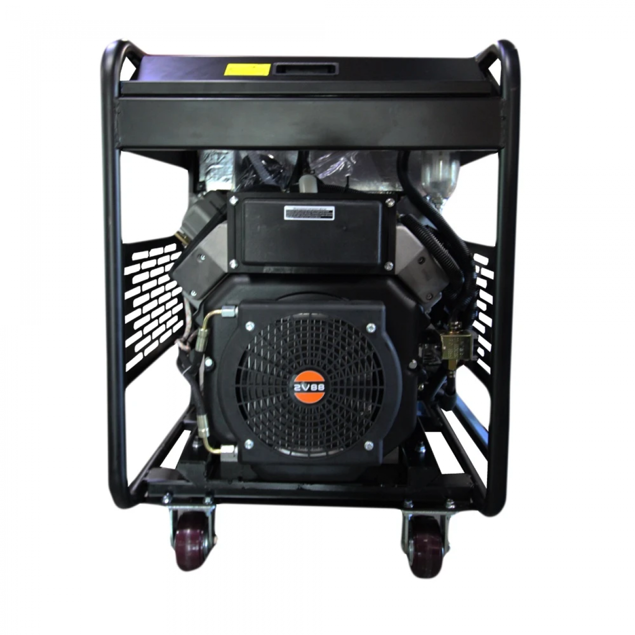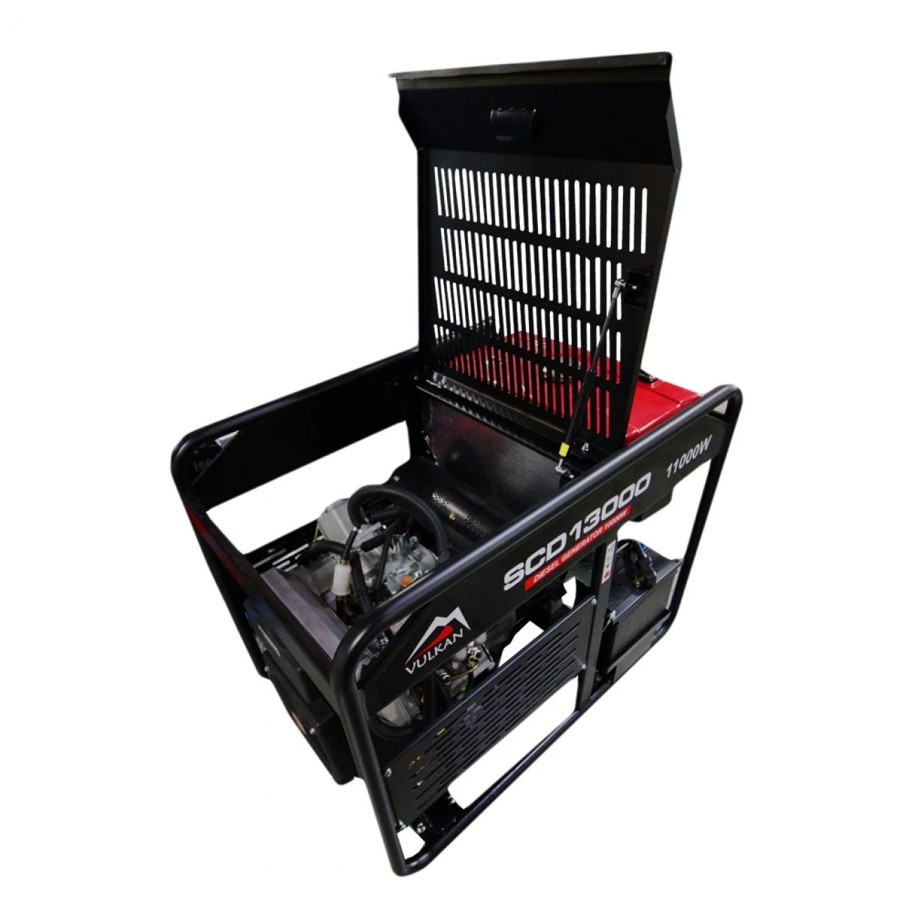 Vulkan SCD13000-ІІ - високопродуктивний дизельний генератор для домашнього та професійного використання. При роботі генерує напругу 220 В або 380 В, яку можна використовувати для підключення електроінструментів або обладнання. На корпусі є 2 розетки: на 16 А 220 В і на 16 А 380 В. Вбудований бак на 42 л дозволяє працювати до 11 годин при навантаженні 100%. У даній модифікації генератора передбачена автоматичне регулювання обертів двигуна, що дозволяє досягти стабільності в роботі незалежно від навантаження.