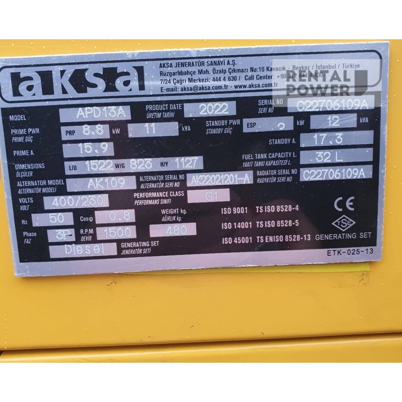 Трифазний дизельний генератор AKSA APD13A на базі оригінального двигуна AKSA A4CRX19 резервною потужністю 9,6кВт для резервного та постійного електропостачання. Електростанція призначається для стаціонарного розміщення та може встановлюватись як у приміщенні (кожух або відкрита комплектація), так і на вулиці (кожух чи контейнер). AKSA APD13MA - це розумна ціна (значно нижча за ринкову вартість) і відмінну якість. Надана модель може використовуватися для резервування електромережі з навантаженням до 9,6, а в безперервному режимі установка може запитувати електроенергією споживачів до 8,8кВт.