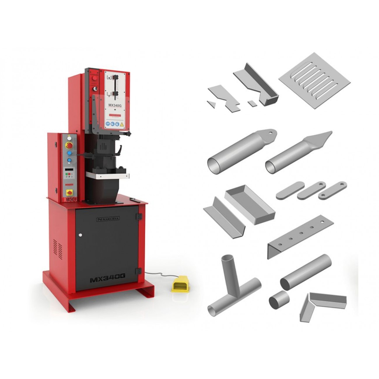 Гідравлічні прес-ножиці МX340G Nargesa вирізняються багатофункціональністю та виконують безліч операцій, як-от: перфорування листового металу, смугового металу, труби, куточка, швелера U-подібного профілю, тавра, швелера UPN, двотавра IPN, Гнуття, різання, пробивання. Гідравлічний пробивний прес багатофункціональний і простий у використанні, що робить його незамінним для роботи в ковальських майстернях.