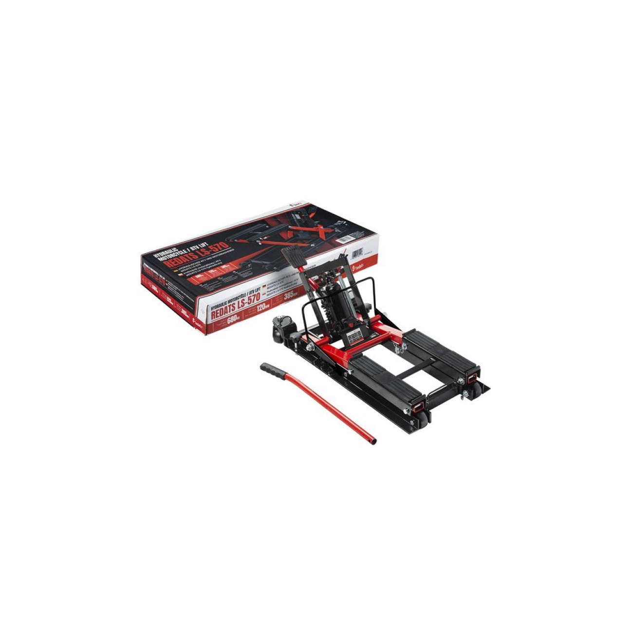 Гідравлічний підйомник для мотоциклів та квадроциклів REDATS LS-570 - це зручне та надійне обладнання для проведення ремонтних робіт і технічного обслуговування мотоциклів, скутерів, квадроциклів та інших транспортних засобів подібного типу, вантажопідйомність якого становить 680 кг. Висота основи 120 мм, максимальна висота підйому - 385 мм. Завдяки гідравлічній системі підйом і опускання плавні та контрольовані. Керування підйомом здійснюється за допомогою педалі.