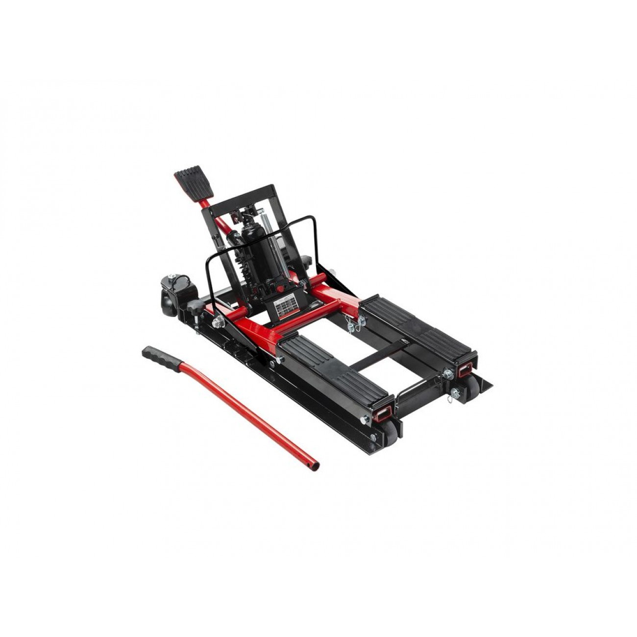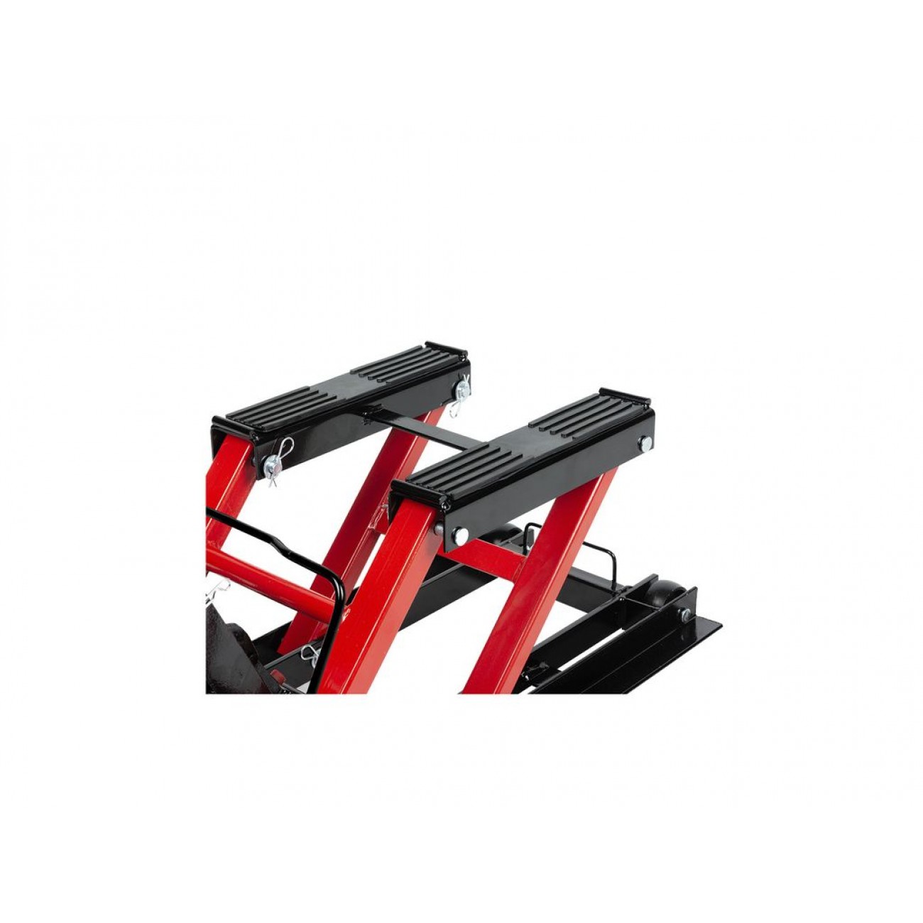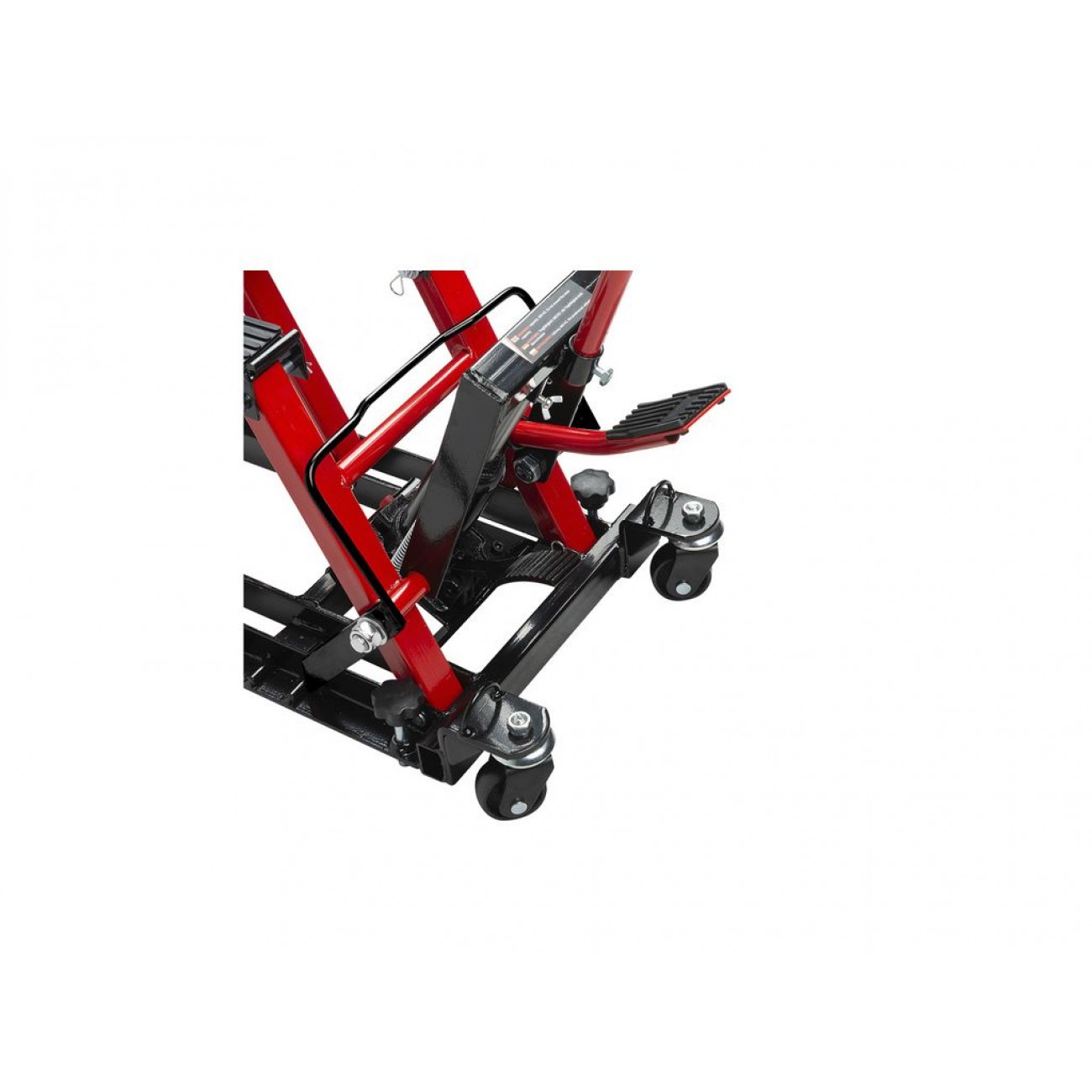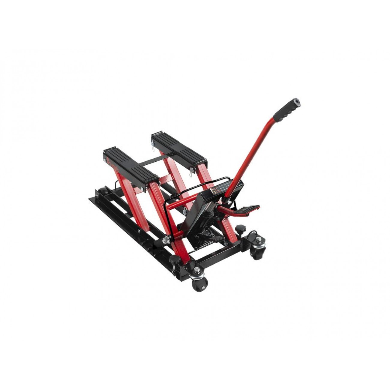 Міцна сталева конструкція має високу стійкість до деформацій і пошкоджень, а широка основа гарантує стійкість до перекидання. Для захисту транспортних засобів підйомні опори оснащені гумовими накладками. Для безпечності роботи є запобіжні засувки. Опційно можна замовити ремені для фіксації транспортного засобу при підйомі. 4 колеса (2 з яких поворотні) і ручка роблять цей підйомник для мотоциклів надзвичайно мобільним.