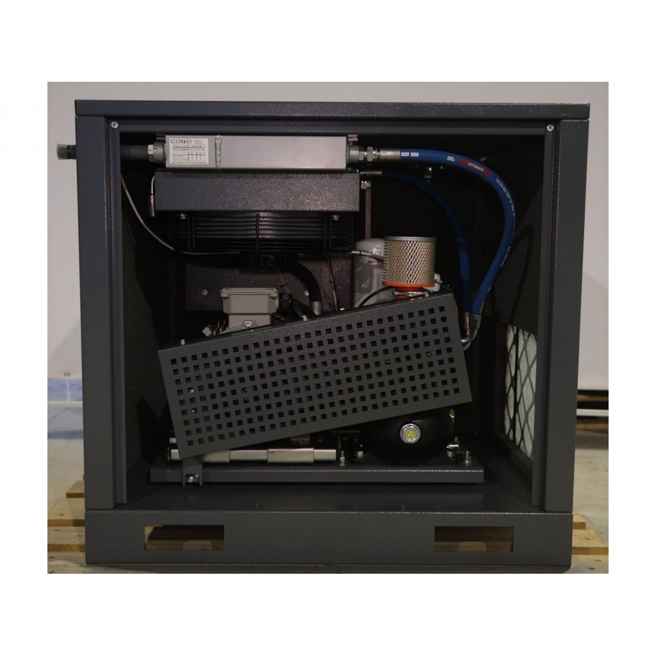 Оснащений надійним двигуном потужністю 5,5 кВт. Тиха робота і мінімум вібрацій завдяки шумоізольованому корпусу. Автоматична система управління дає змогу зручно відстежувати і коригувати параметри роботи. Виготовлений з якісних компонентів європейського походження, цей компресор характеризується надзвичайною надійністю і тривалим терміном служби.