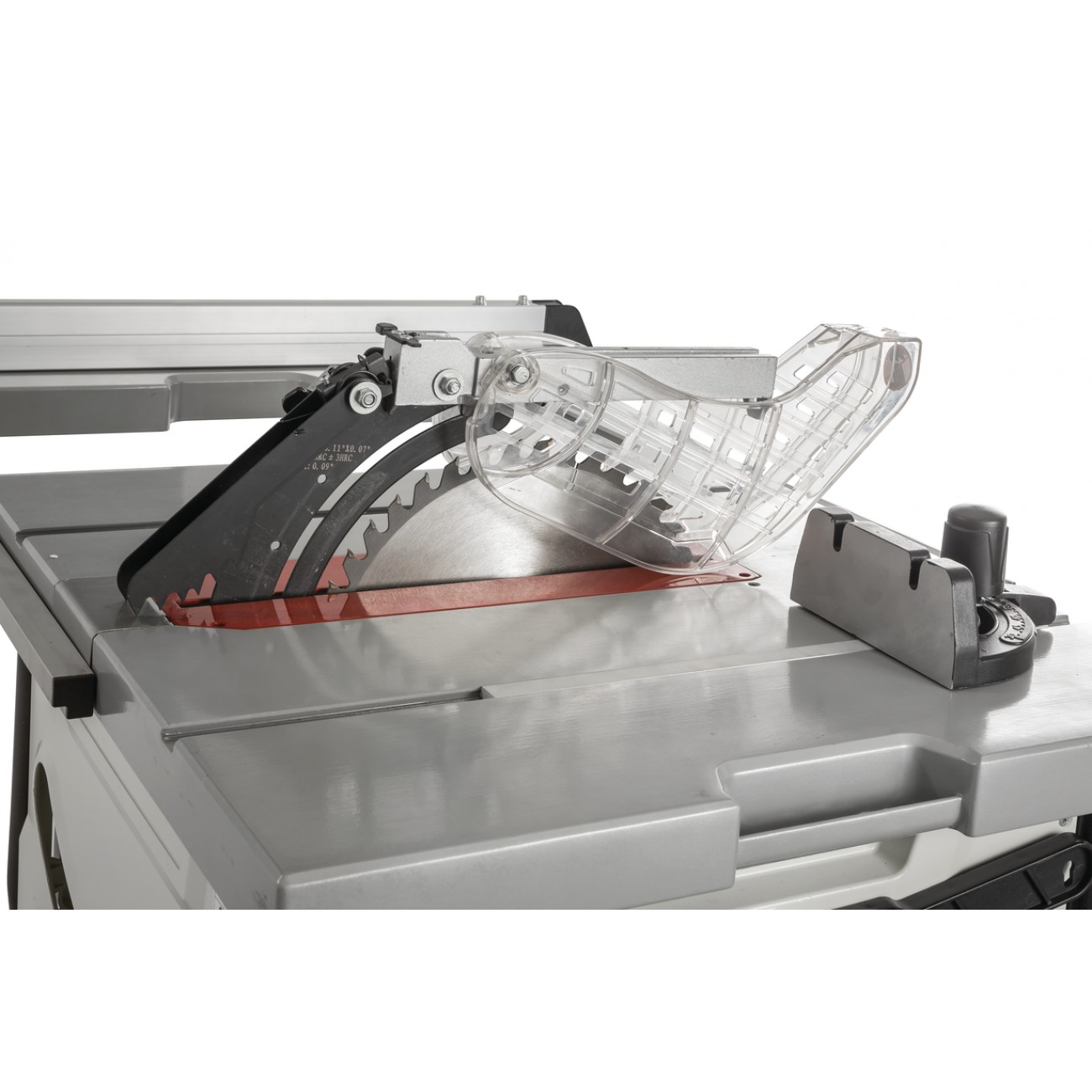 JSTS-10-M компактная настольная циркулярная пила любительского класса. Станок имеет хорошо продуманную конструкцию, позволяющую производить множество настроек для решения самых разных задач. Можно увеличить размер рабочей поверхности, выдвинув секцию расширения (установлена справа от пильного диска), снять, установить или настроить по высоте расклинивающий нож (процедура выполняется сверху стола без вспомогательных инструментов); предусмотрен даже монтаж когтевой защиты против выброса заготовки назад.