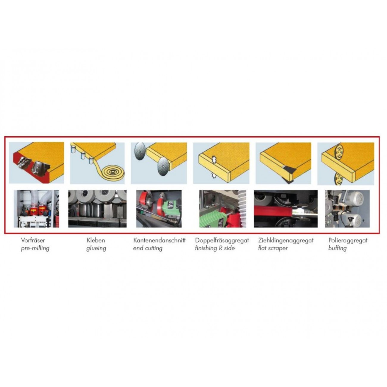 • Вузол фрезерування звисів оснащений двома радіусними фрезами R2 (електродвигун кожній – 0,75 кВт, 12000 об/хв) і плаваючими копірами, що дозволяють відслідковувати товщину заготовки, що забезпечує відмінну якість оброблюваної поверхні.