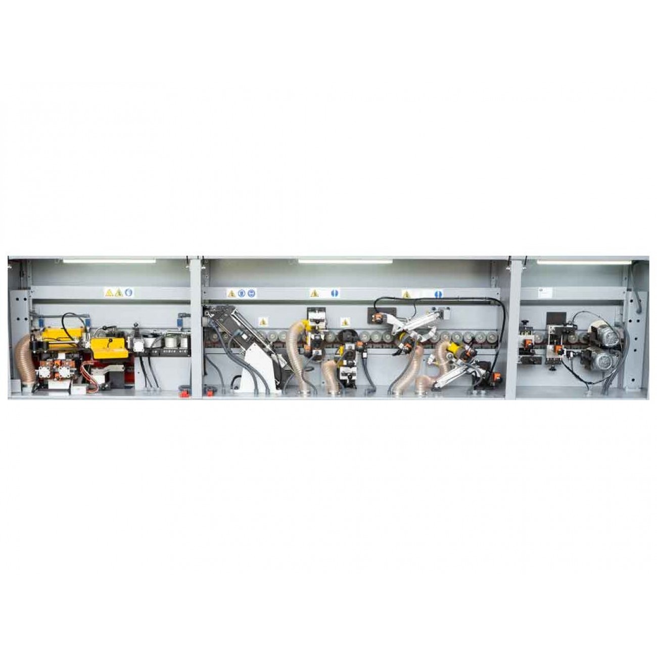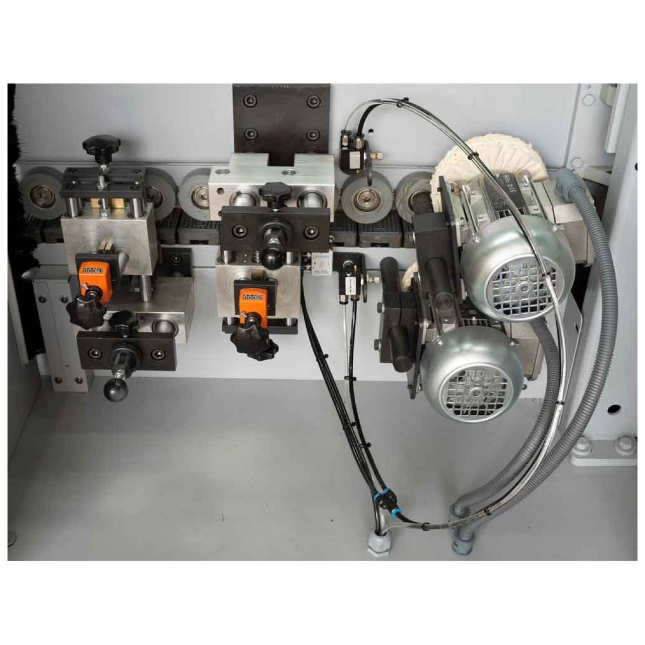 Клейовий ролик має спеціальну поверхню, що забезпечує точне і рівномірне нанесення клею. Температуру клею можна регулювати за допомогою сенсорного дисплея. Високоякісні притискні ролики забезпечують ідеальне з’єднання кромки і заготовки. Тиск роликів налаштовується автоматично. Панель керування зі зрозумілим інтерфейсом дозволяє зручно відстежувати і коригувати параметри роботи, а масивна, жорстка станина підтримує стабільність і точність обробки. Завдяки високій продуктивності і широкому функціоналу, цей автоматичний кромкоклеючий верстат відмінно підходить для середніх меблевих виробництв.