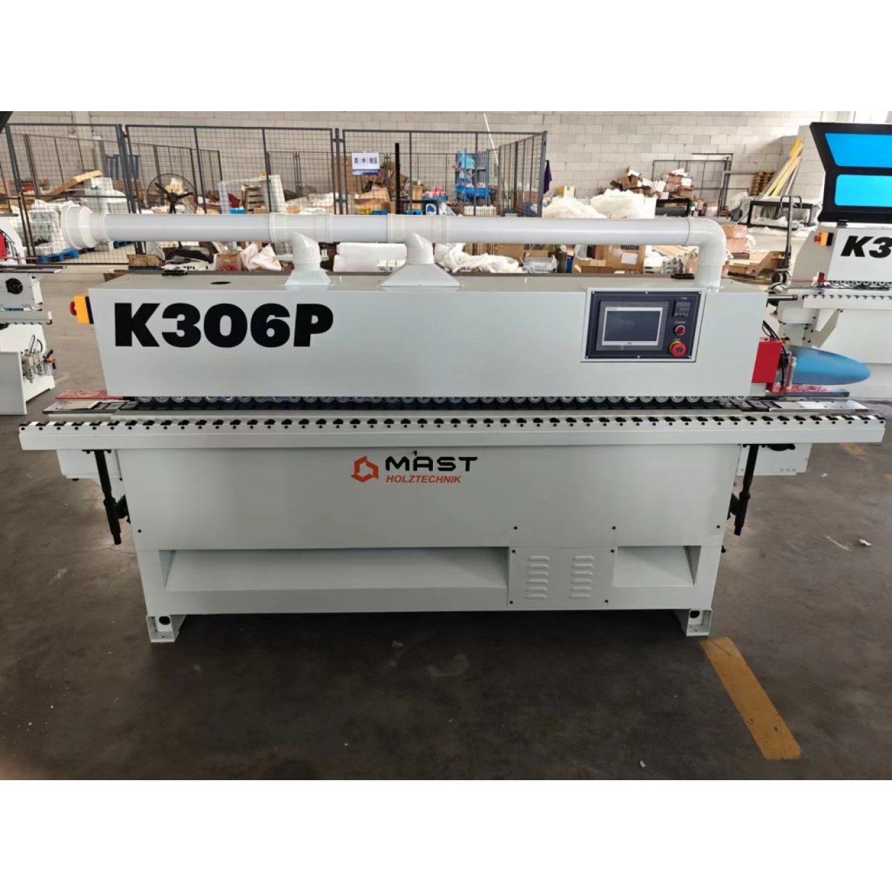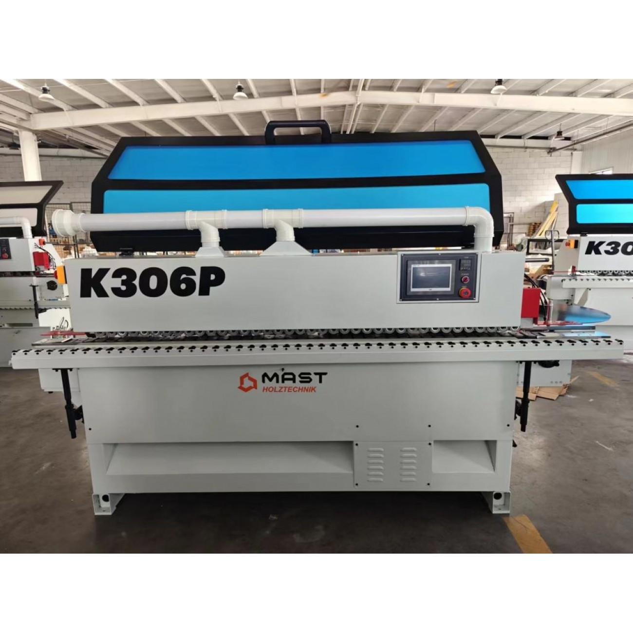 Кромкооблицювальний верстат MAST Holztechnik K306Р прохідного типу призначений для прямолінійної поклейки ПВХ, ABS та меламінових кромок товщиною до 3 мм на меблеві деталі з ЛДСП, МДФ і фанери. Оснащений основними робочими вузлами, що дає змогу проводити повний цикл обробки за один прохід. Має просте і зрозуміле управління кожним вузлом за допомогою пульта керування Тачскрін (Delta) з україномовним інтерфейсом.