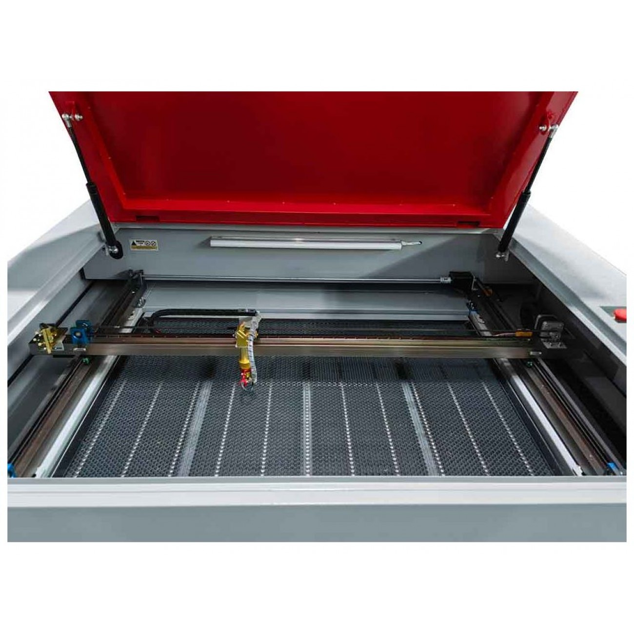 Верстат оснащений високоякісним CO2 лазером потужністю 80 Вт. Розмір робочої зони 600х900 мм дозволяє працювати з досить великими заготовками. Швидкість різання - 200 мм/с, швидкість гравіювання - 500 мм/с. Максимальна висота різу - 15 мм. Система охолодження запобігає перегріву лазера і деформації матеріалів. Такий лазерний гравер різак буде ефективним при виробництві декоративних елементів меблів, у моделюванні та виготовленні рекламних конструкцій.