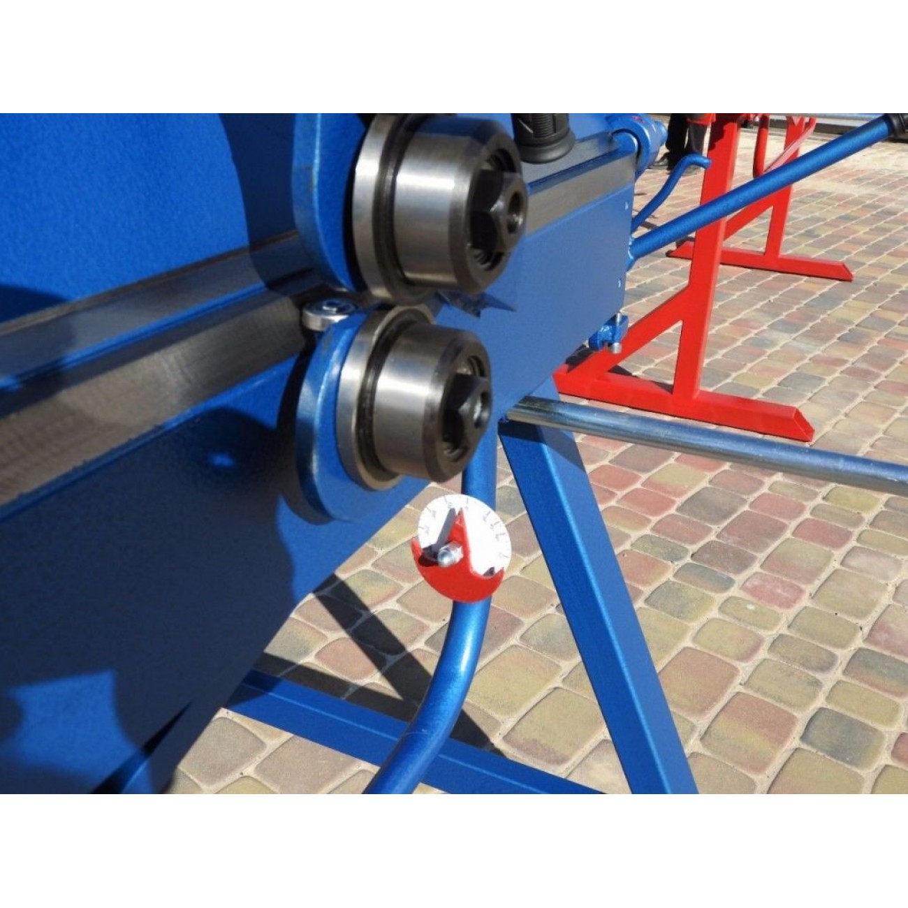Згинальна і притискна балки виготовлені з високоякісного металу і мають високу стійкість до деформацій. Для точного виставлення кута згину верстат оснащений градусною шкалою. Для точного згинання заготовки під потрібним кутом є вбудований кутомір. У задній частині верстата є упори для підтримки листів. Глибина подачі заготовок необмежена. Опційно доступні до замовлення роликовий ніж і доварювальник, завдяки яким цей згинальний верстат для листового металу стане ще більш функціональним.