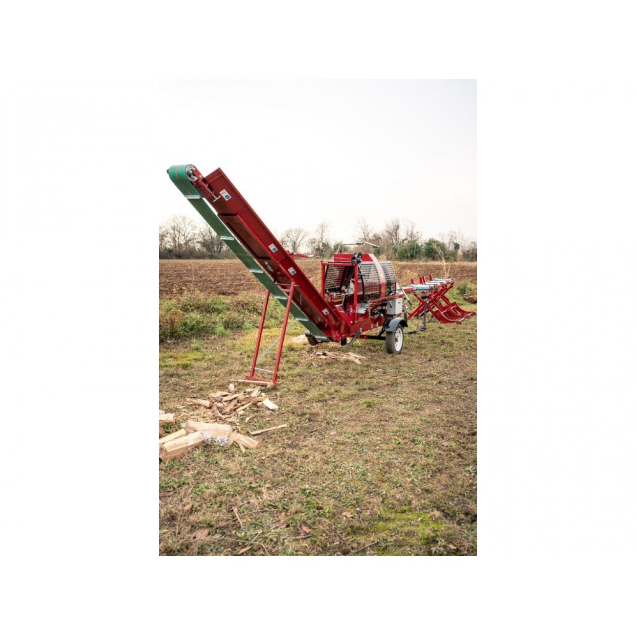 Додаткове обладнання, таке як підйомник колод або ланцюговий конвеєр, ще більше полегшує робочий процес. Ланцюговий конвеєр дозволяє завантажувати кілька колод за допомогою вилкового навантажувача, крана або фронтального навантажувача, усуваючи необхідність піднімати одну колоду за раз.