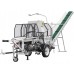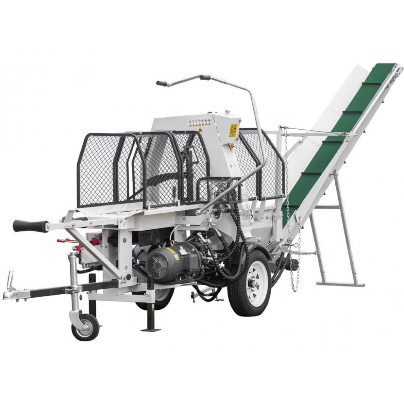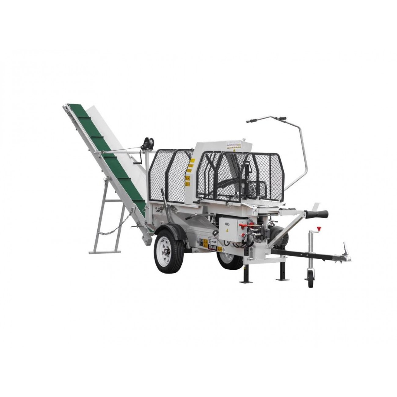Гідравлічна ланцюгова пила розпилює колоду по всій довжині, а гідравлічний хрестоподібний клин розколює її на 4 частини. Подача колоди до ріжучого блока і вивантаження дров здійснюються автоматично, за допомогою гідравлічного стрічкового конвеєра довжиною 3,2 м. Для захисту від вильоту стружки і випадіння колод є захисна огорожа, а для переміщення обладнання - 2 великих колеса і фаркоп. Потужний функціонал і надійна конструкція дозволяють успішно використовувати цей напівавтоматичний дроворіз для бізнесу (комунальні підприємства, підприємства по заготівлі дров тощо), а також у великих приватних господарствах.