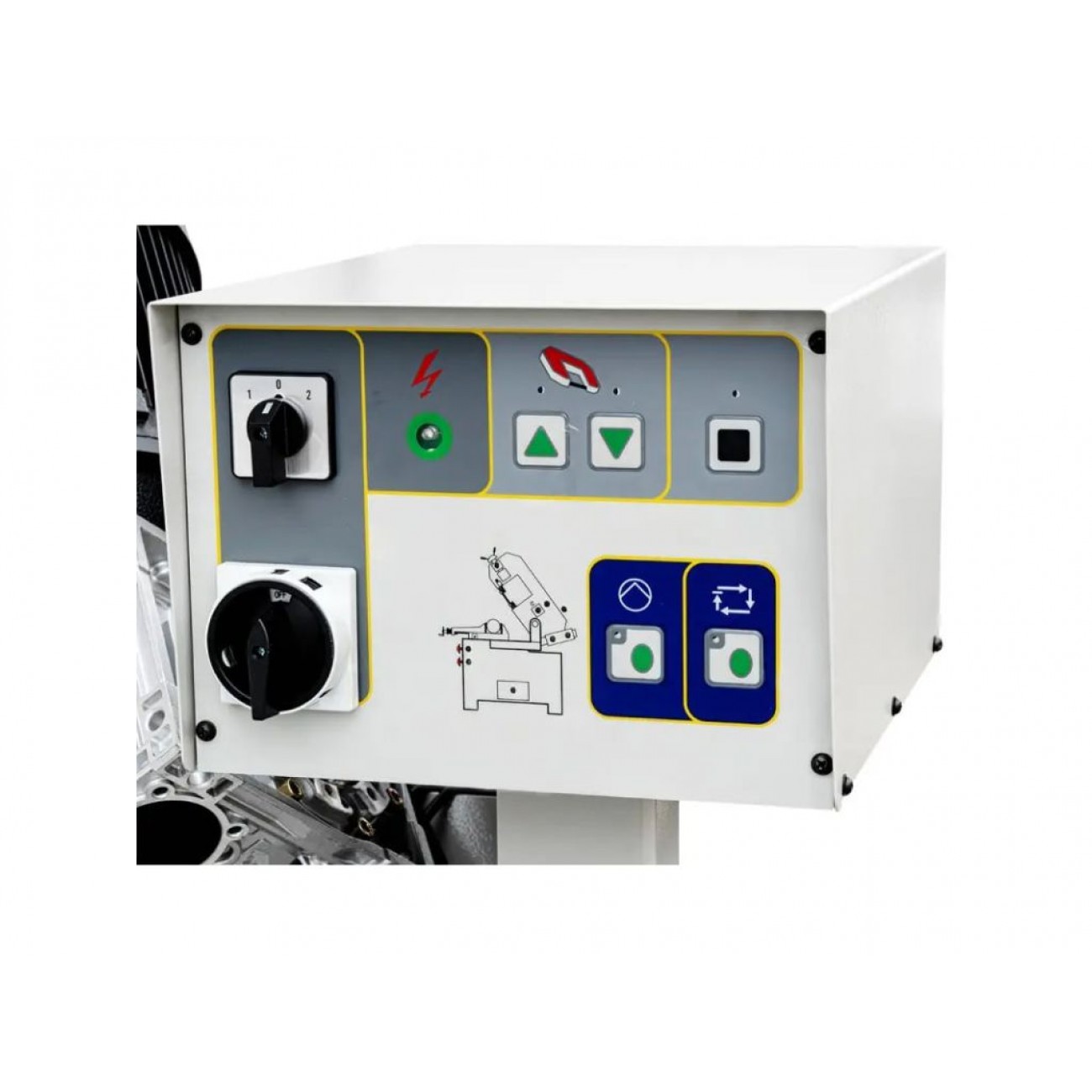 Машина оснащена ефективним насосом охолодження з замкнутим контуром, а привод передається через зубчасту передачу. Трифазний двигун має дві швидкості різання і термозахист. Додатково, пила обладнана годинниковим тензометром для контролю натягу стрічки та автоматичним вимикачем при обриві.