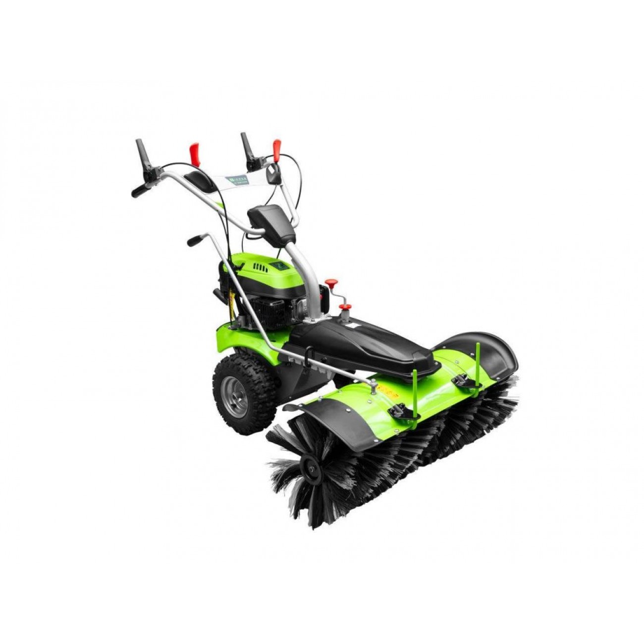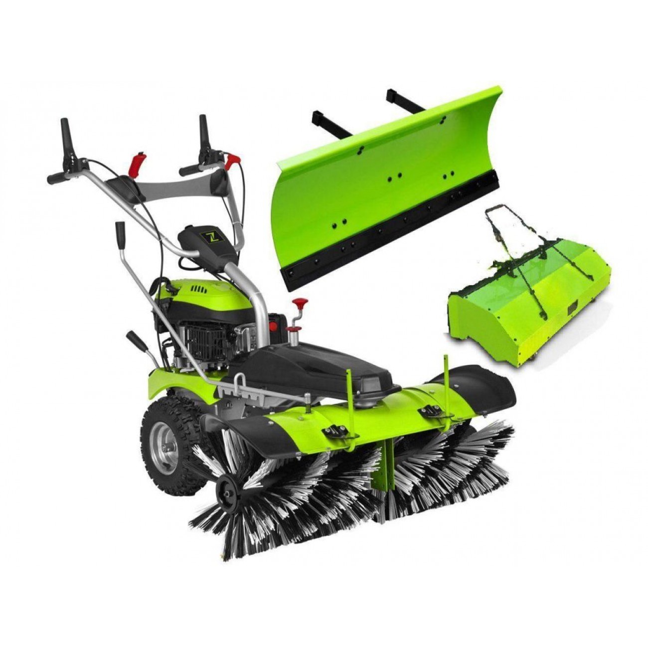 Підмітальна машина ZIPPER ZI-KM1000 - це професійне обладнання для прибирання середніх і великих площ від сміття, листя і снігу. Ширина щітки 100 см і 4-тактний бензиновий двигун потужністю 6,5 к.с. зі збільшеним моторесурсом забезпечують швидку та ефективну роботу. Щітка діаметром 350 мм має 2 швидкості обертання, 180 і 350 об/хв, регулюється по висоті і куту нахилу. Машина може вимітати сміття перед собою або збирати його у 80-літровий контейнер, який входить у стандартну комплектацію. Також в комплект поставки входить сніговий відвал.