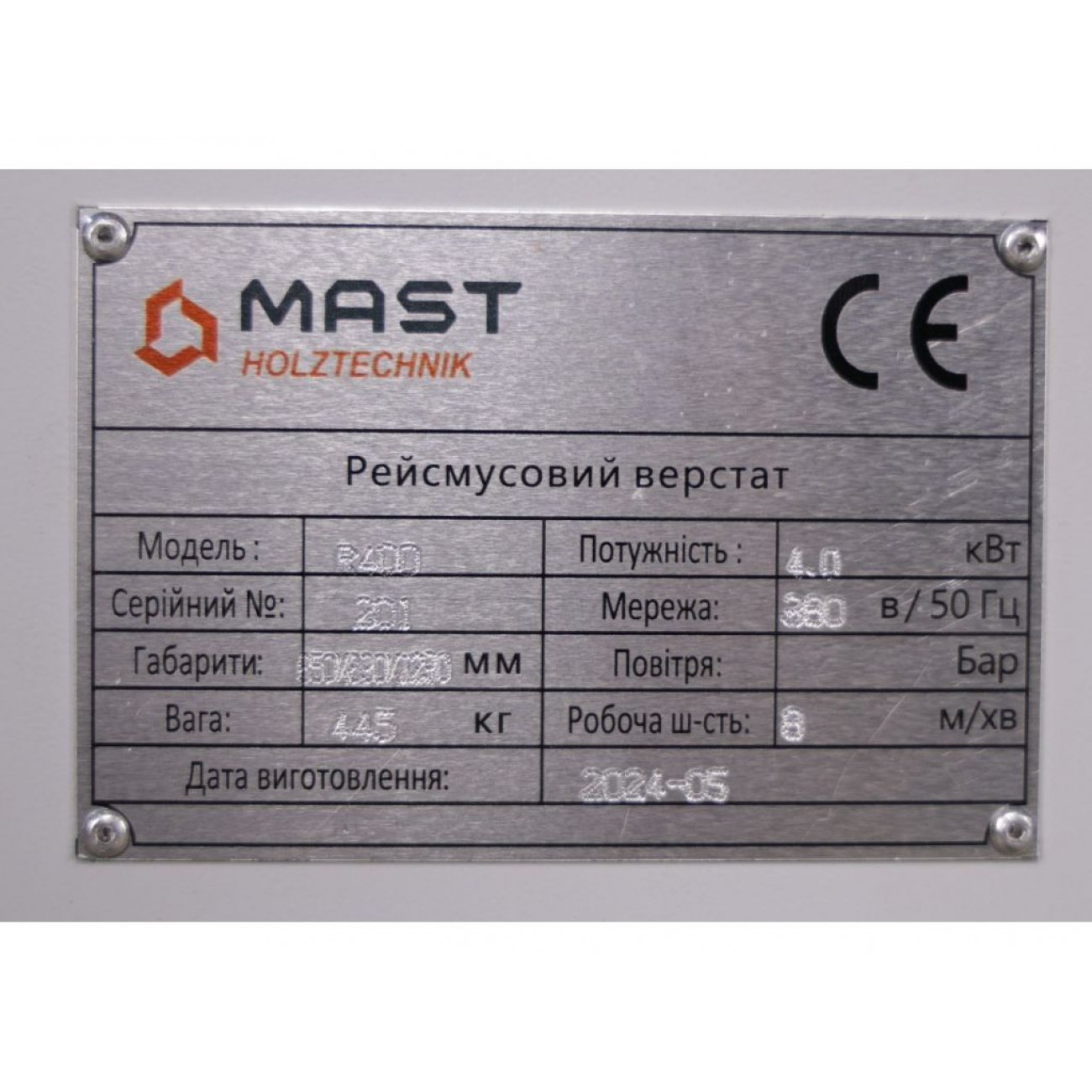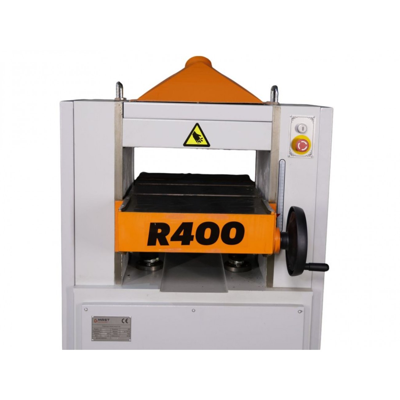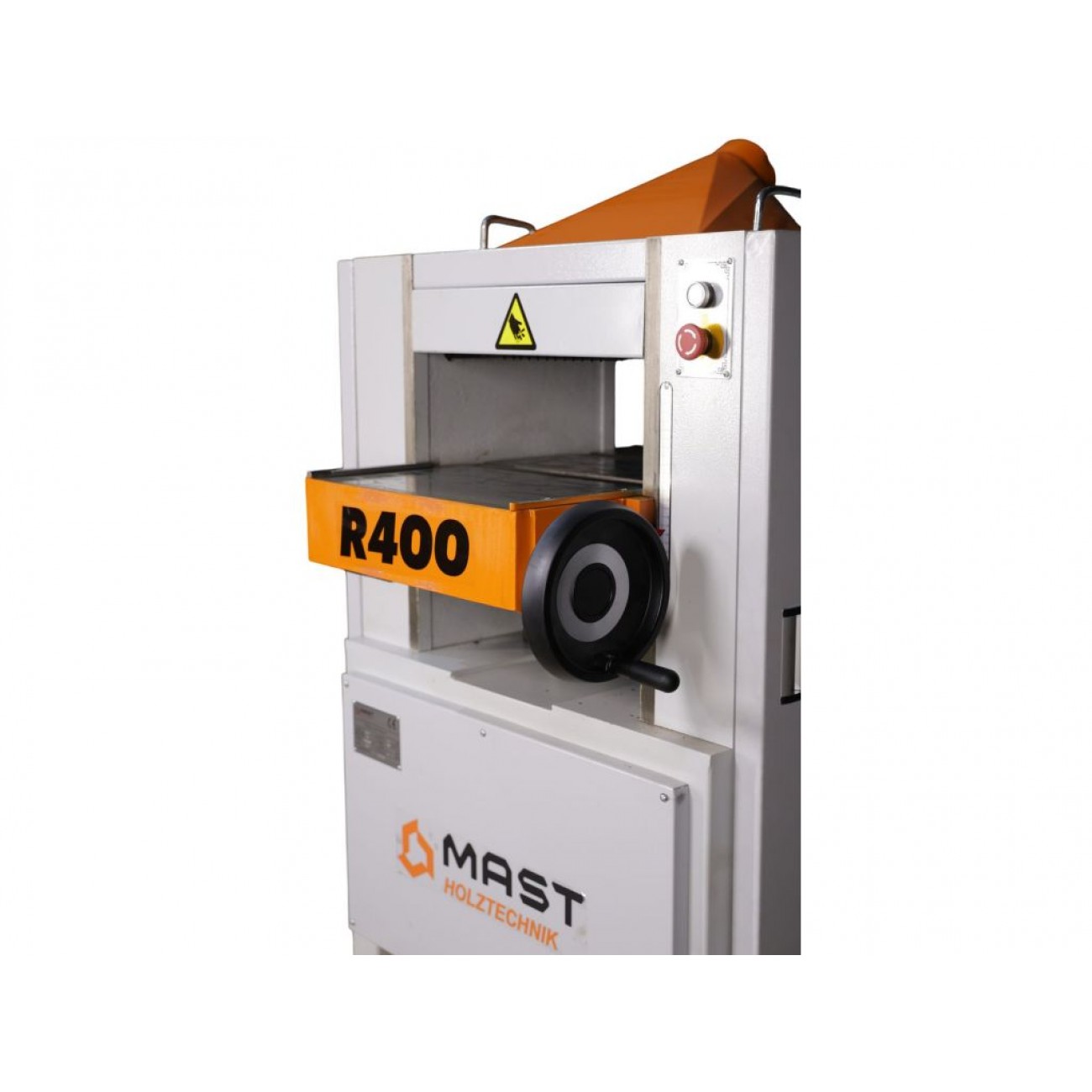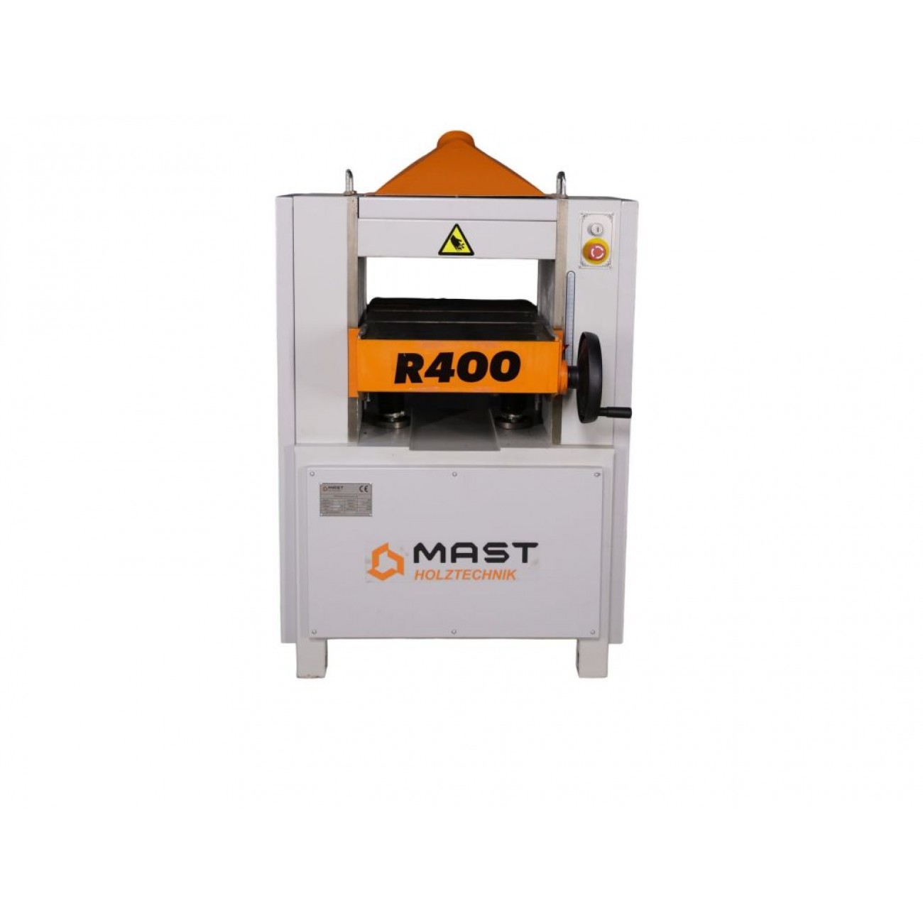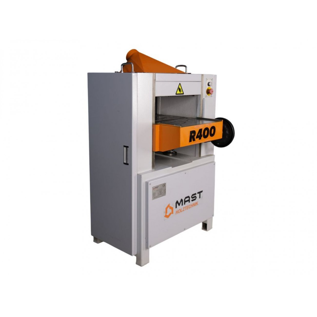 Рейсмусовий верстат MAST Holztechnik R400 використовується для калібрування дошки та бруса у розмір і по товщині. Підходить для заготовок товщиною від 8 до 200 мм і шириною до 400 мм. Обробка здійснюється за допомогою стругального валу з 4 лезами і швидкістю обертання 4800 об/хв. За один прохід знімає до 5 мм стружки.