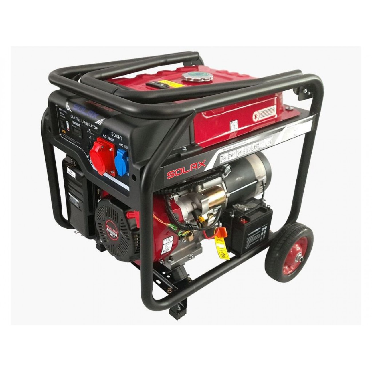 Для запобігання несправностям генератор оснащений захистом від низького рівня мастила. Відкрита конструкція корпуса доповнена жорсткою сталевою рамою. Завдяки великим колесам і зручній ручці, цей трифазний бензиновий генератор можна легко переміщати по території.