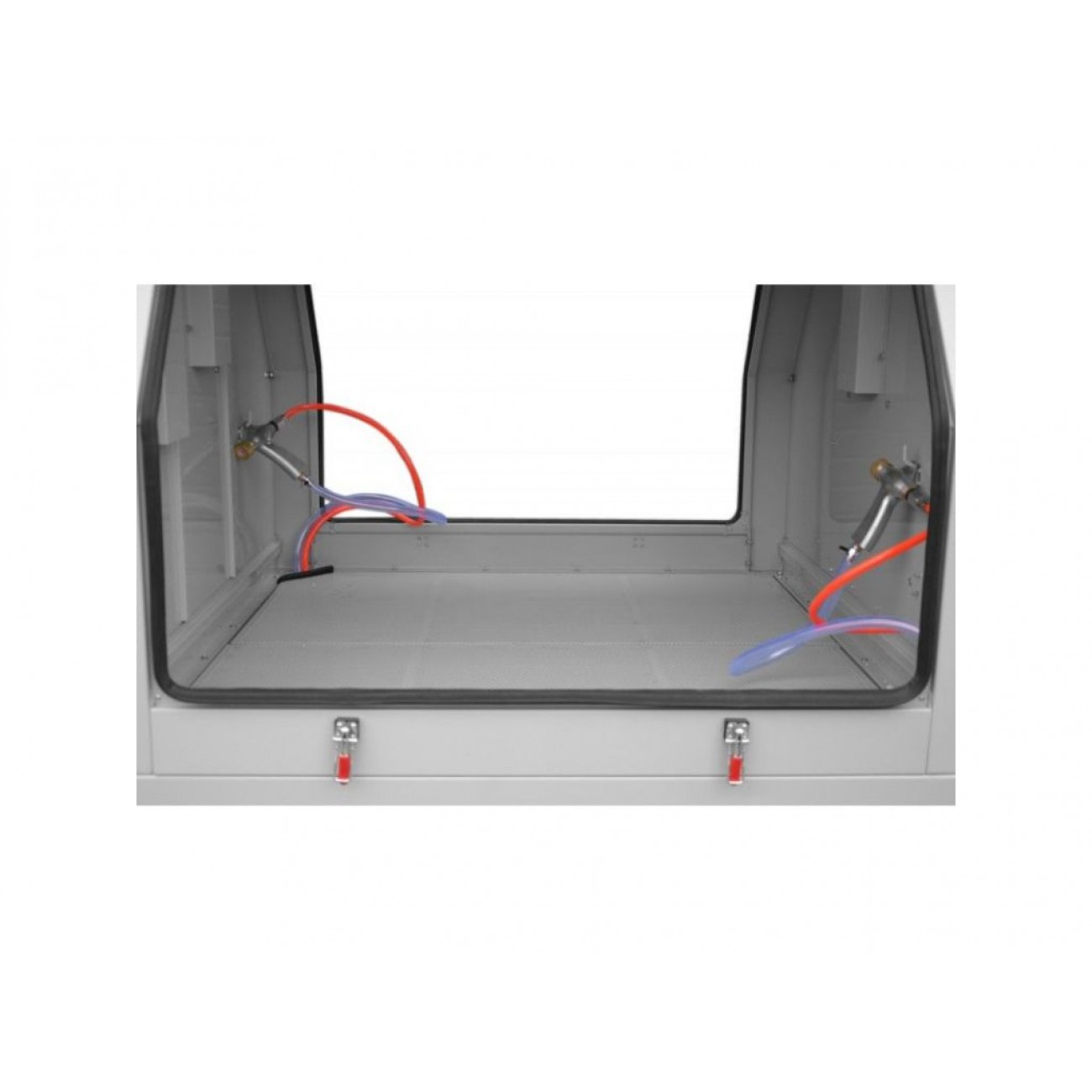 Робочий тиск камери становить 4-8 Бар, для обробки можна використовувати різні типи абразивних матеріалів. Ефективна система пиловидалення з циклонним фільтром підтримує чистоту робочого місця і оптимальну видимість робочої зони. Конструкція камери виготовлена з високоякісних матеріалів і характеризується високою міцністю та стійкістю. Зважаючи на всі переваги, ця двопостова піскоструминна камера буде ідеальним вибором для професійних майстерень і виробництв.