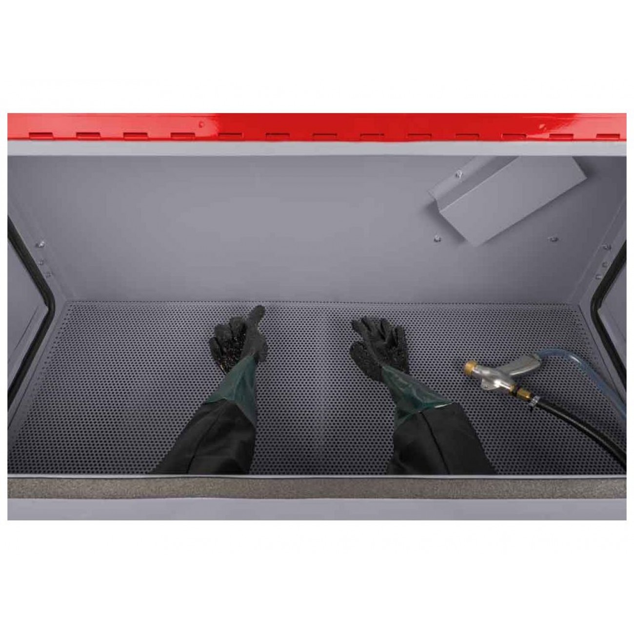 У комплект поставки входить піскоструминний пістолет з 4 керамічними насадками, що дозволяє коригувати інтенсивність і напрямок абразивного потоку, та пара гумових рукавиць з фіксованим кріпленням для стаціонарного встановлення. Камера обладнана системою пиловловлювання з продуктивністю 156 м³/год і освітленням робочої зони. Оглядове вікно без сліпих зон дозволяє максимально контролювати процес очищення. Ця піскоструминна камера ціна якої вигідна за рахунок прямих поставок від виробника, доступна для замовлення на KMA.UA.