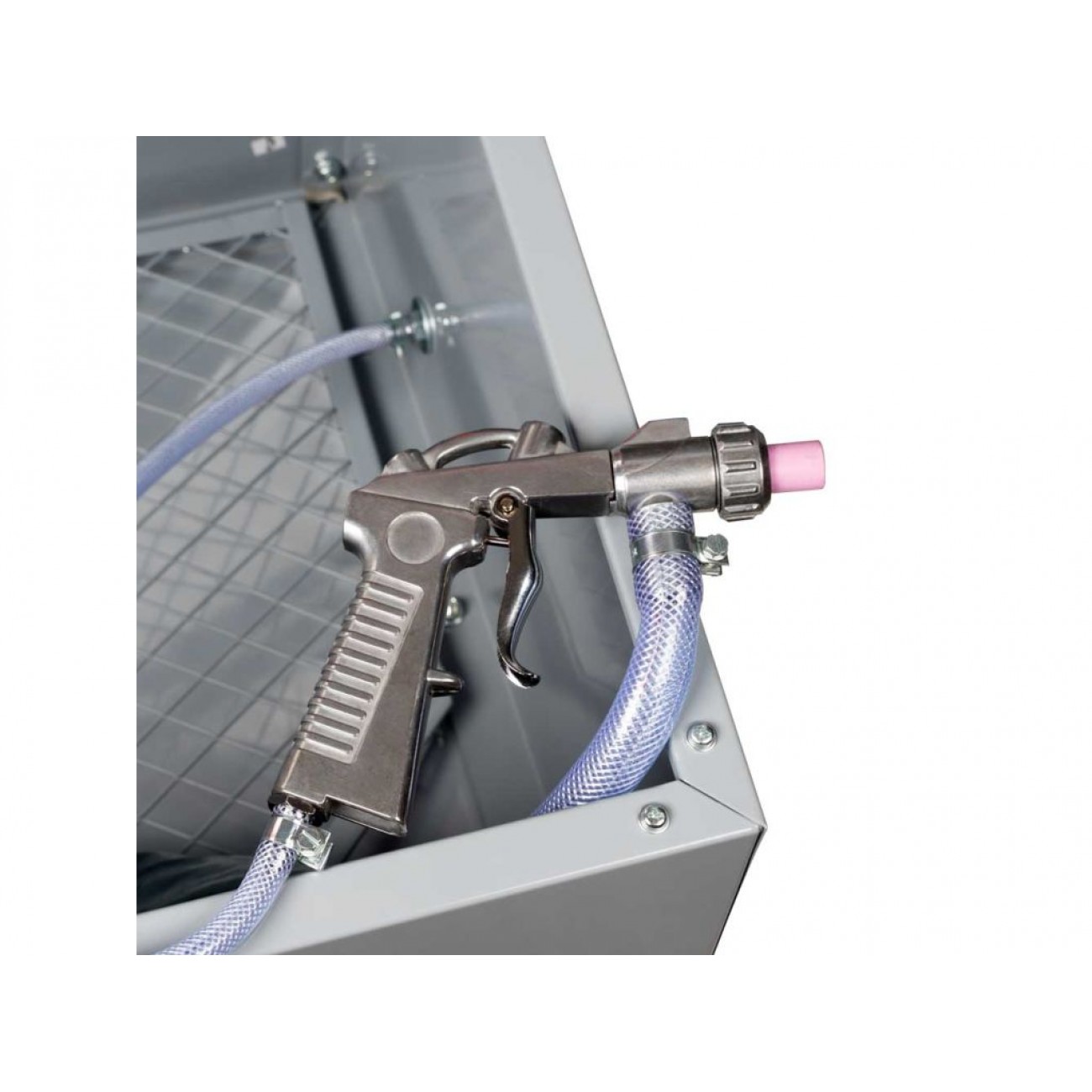 У комплектацію камери входить піскоструминний пістолет з 4 змінними керамічними насадками, що дає змогу коригувати напрямок та інтенсивність абразивного потоку, і пара високоякісних гумових рукавичок з фіксованим кріпленням для стаціонарного встановлення. Підсвічування робочої зони і розташоване зверху велике оглядове вікно дозволяють ретельно контролювати процес обробки. Якщо вас зацікавила ця мобільна піскоструминна камера купити її на нашому сайті можна з гарантією 24 місяці.