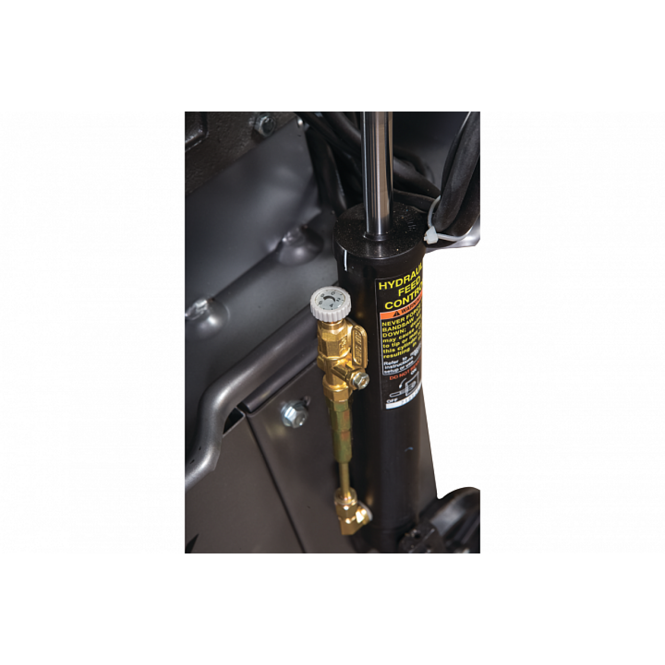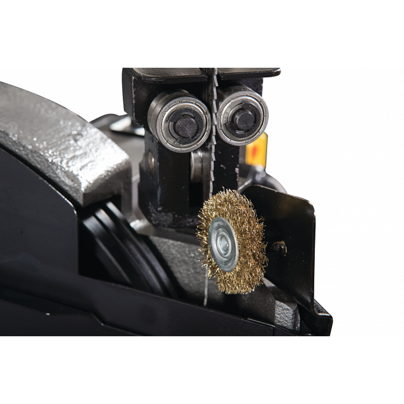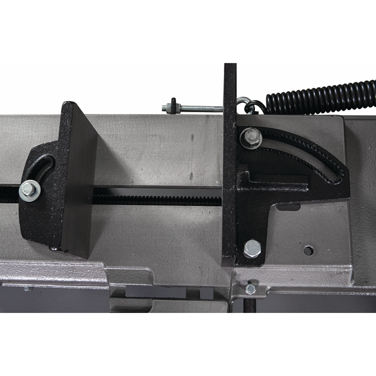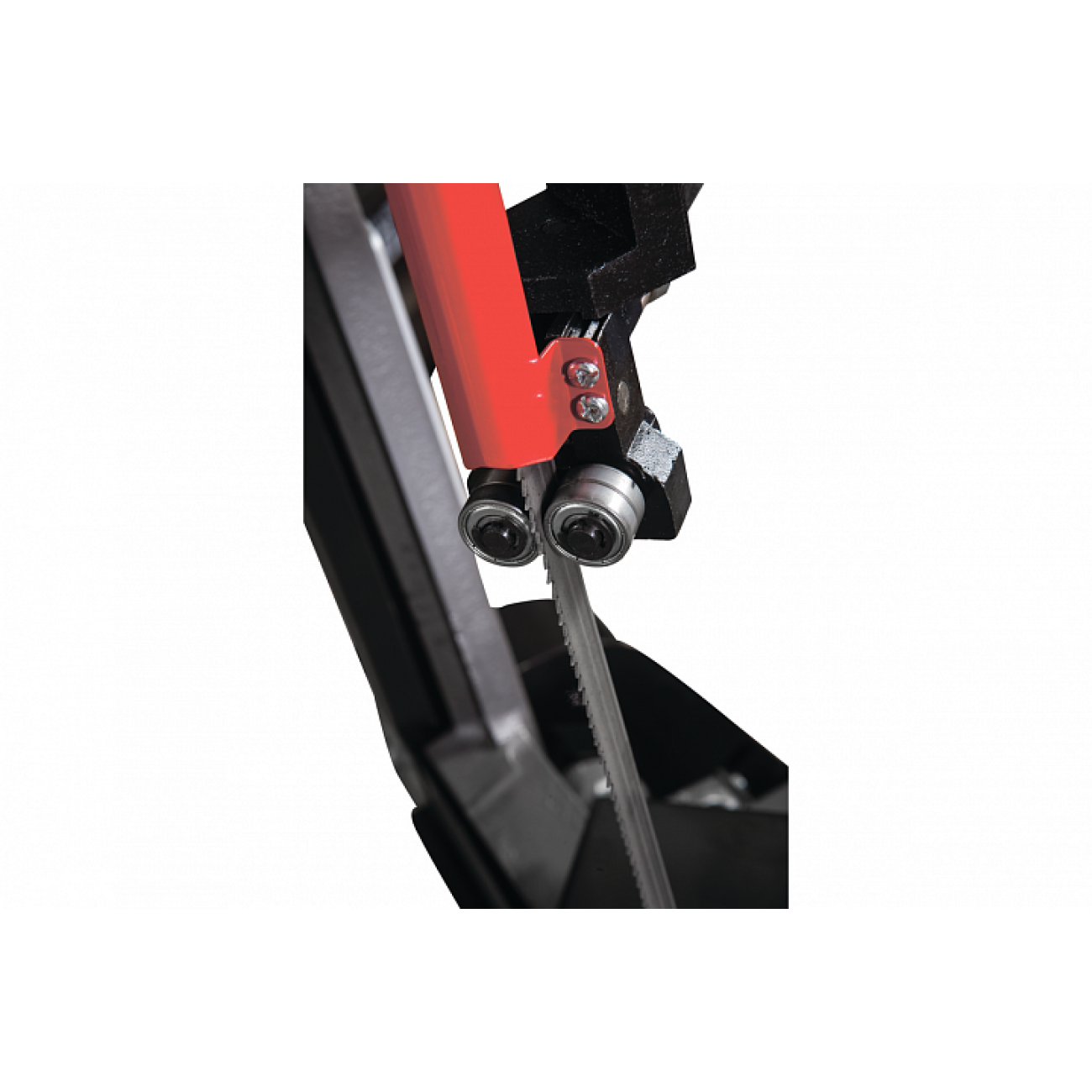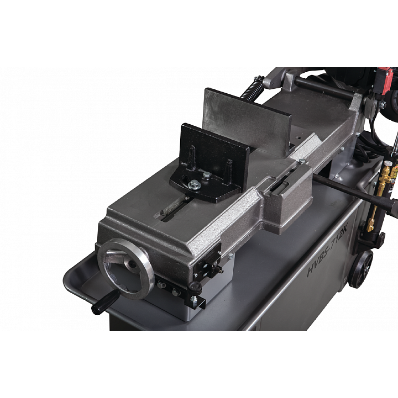 Модель HVBS-712K имеет направляющие, передвигающиеся по консоли. С помощью направляющих можно установить оптимальную величину прохода пилы, повышая качество распила и увеличивая срок эксплуатации ленточного полотна. Направляющие оснащены 5 подшипниками, регулирующими позиционирование ленточной пилы относительно обрабатываемой заготовки, обеспечивая точность распила. На нижней части пильной рамы установлены диск очистки полотна от стружки. Станок оборудован системой подачи СОЖ непосредственно в зону резания. Натяжение ленточного полотна регулируется вручную.