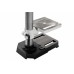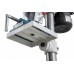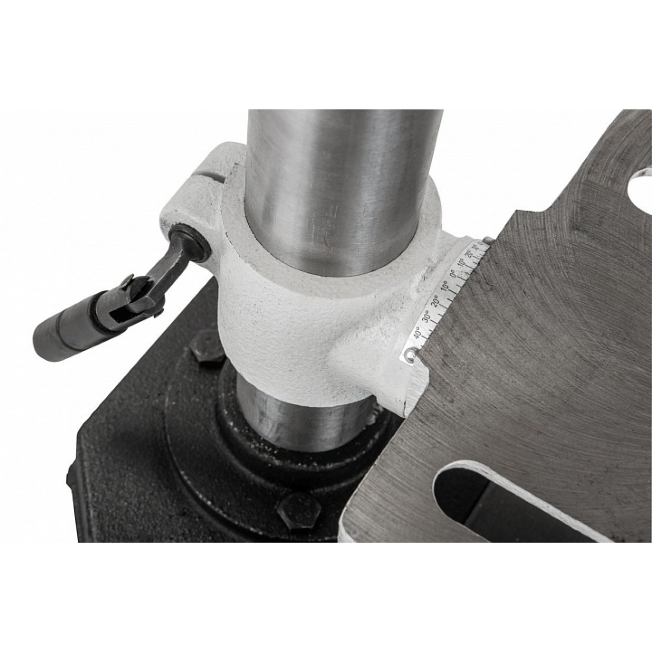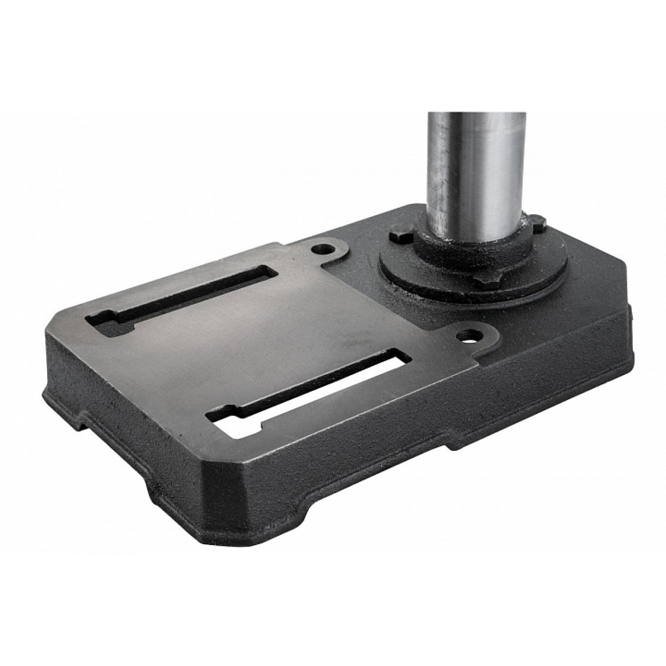 Пиноль шпинделя оборудована резьбовым упором-ограничителем, это простой в настройке и точный механизм, позволяющий производить установки с помощью штангенциркуля, или просто отсчитывая обороты гайки. Заготовку размещают на регулируемом чугунном столе. Он поворачивается вокруг горизонтальной оси, перемещается вверх и вниз по колонне, а если потребуется разместить крупную заготовку, может быть отведен в сторону разворотом на колонне. В таком случае опорой выступает верхняя поверхность подставки станка, отфрезерованная в плоскость, перпендикулярную оси сверления.