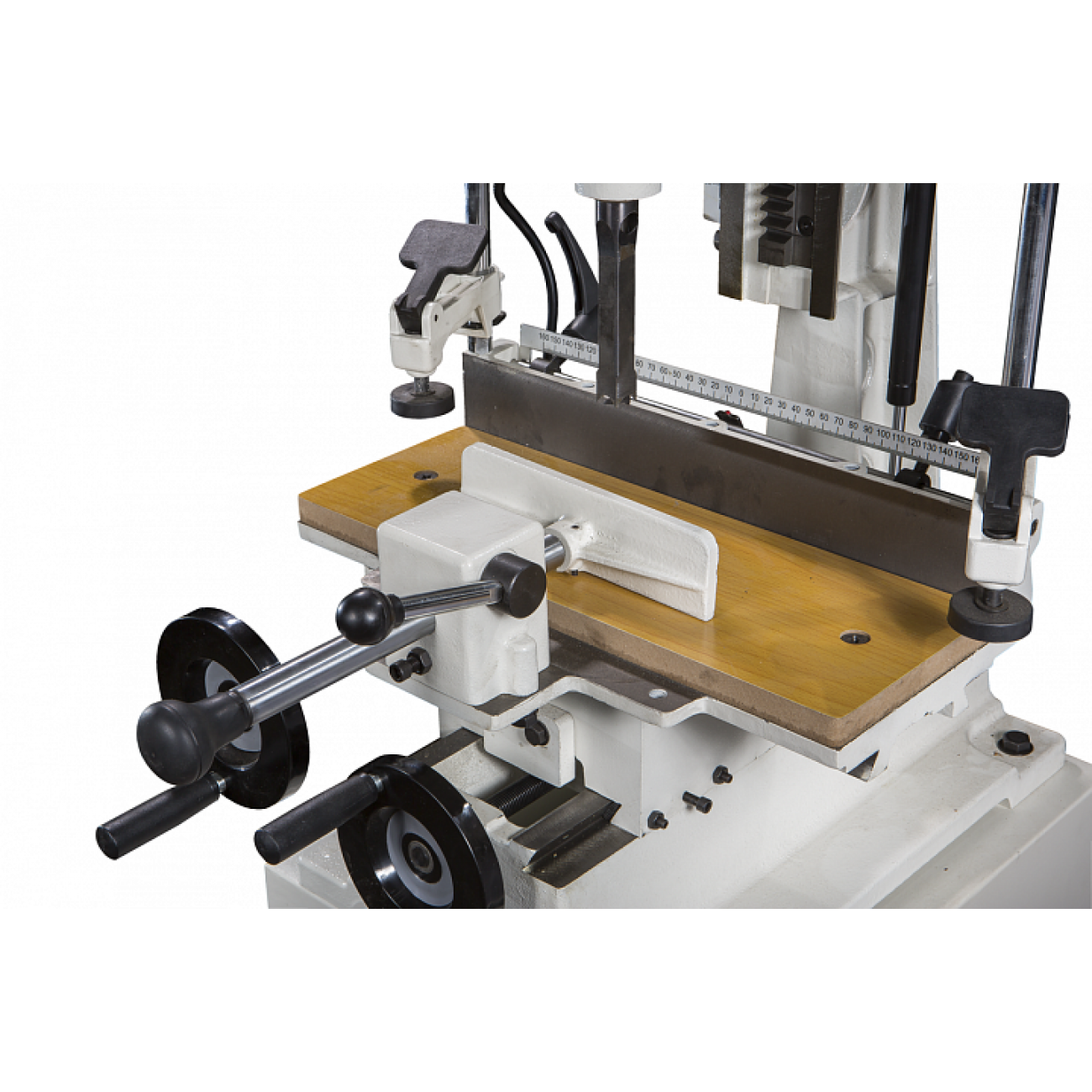 Предусмотрено несколько вариантов фиксации заготовки, что позволяет выбрать наиболее удобный способ работы. Прежде всего, деталь можно вручную прижимать к основному упору, жестко закрепленному на столе параллельно продольной оси подачи. Для подпора с другой стороны есть параллельный ему подвижный упор с эксцентриковым стопором выбранного положения. С двух сторон стола на вертикальных штангах смонтированы два одинаковых вертикальных прижима. Их можно поворачивать на оси и сдвигать вверх или вниз, отжав пластинчатый стопор (как на трубных струбцинах); прижим производится эксцентриковым механизмом. Наконец, для продольного позиционирования заготовок есть торцевой упор с несколькими степенями свободы для установки в разных плоскостях.