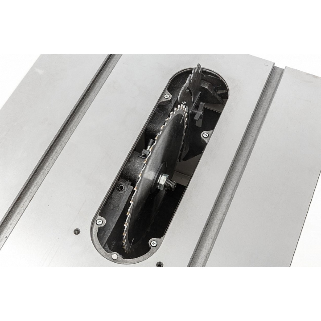 Станок может работать с обычными пильными дисками или с наборными пазовальными фрезами Dado. Замена оснастки производится сверху, после демонтажа вставки. Для упрощения процедуры предусмотрен подпружиненный штифт блокировки шпинделя.