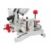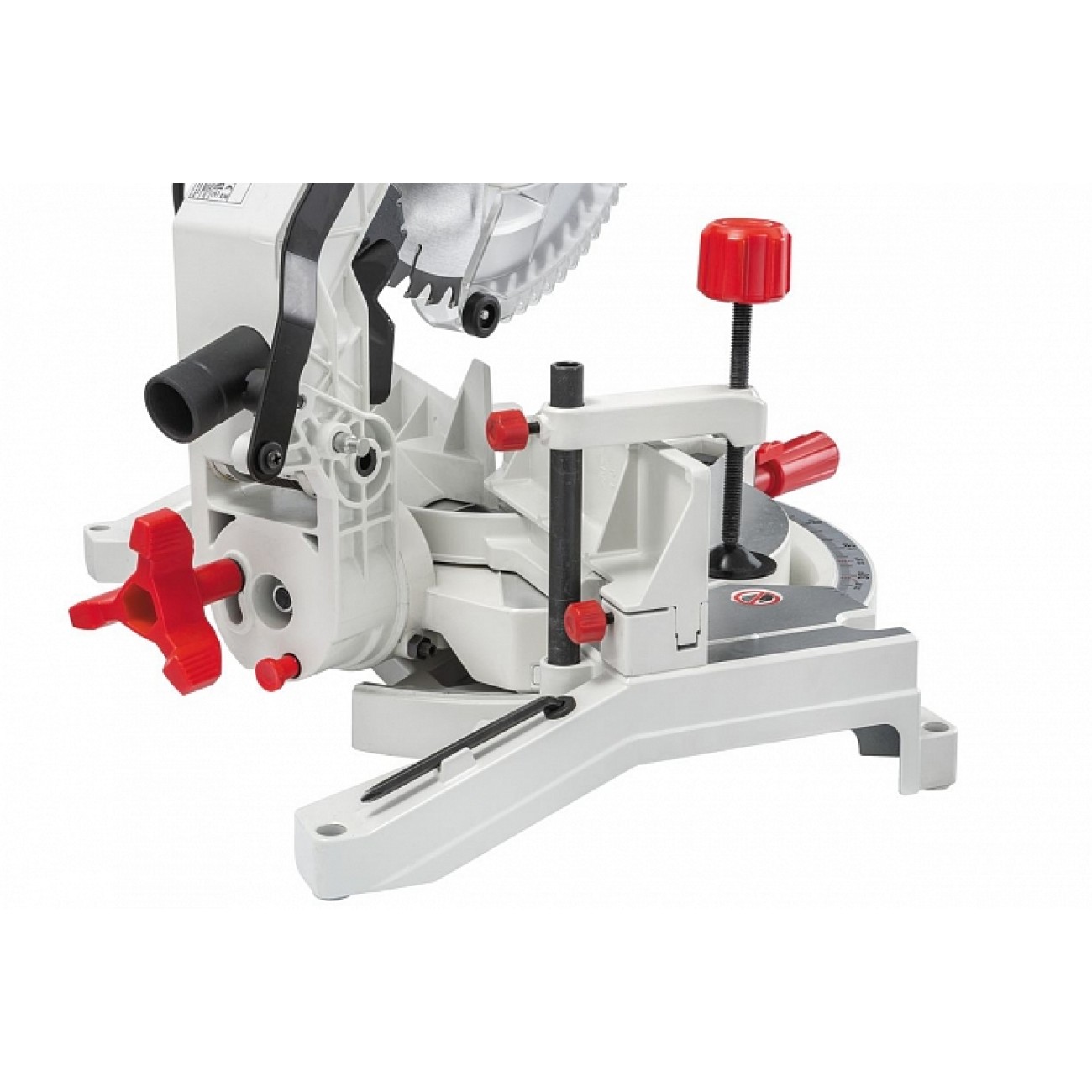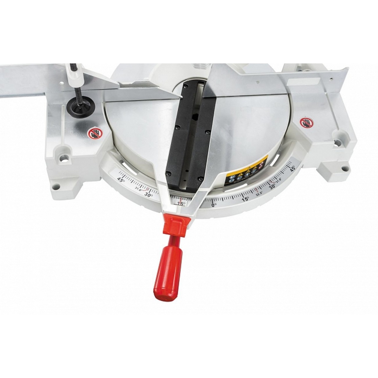 Диапазон регулировки угла наклона растянут на три градуса в обе стороны: до 48° в одну и до -3° от вертикали в другую. Поскольку необходимость установки таких значений возникает редко, механизм имеет жесткие упоры значений 0° и 45°, которые снимаются нажатием на блокирующий штифт. Поворот пильной части относительно стола возможен так же на угол до 48°, но уже в обе стороны. Фиксация выбранного значения производится или вращением рукоятки винтового зажима, или подпружиненным стопором предустановленных значений (0, 15, 22.5, 31.6, 45 и 48°), который снимается нажатием на «язычок» над ручкой.