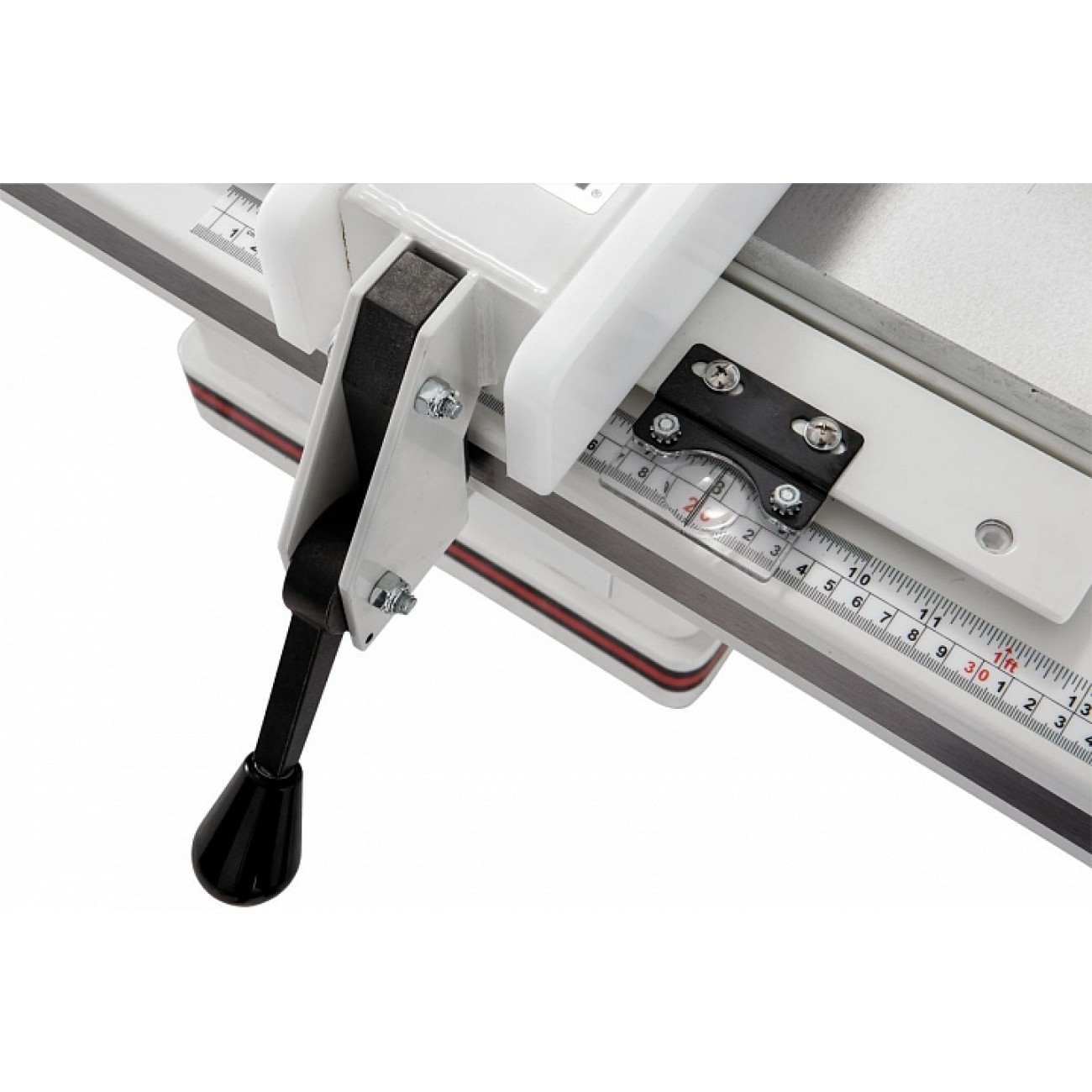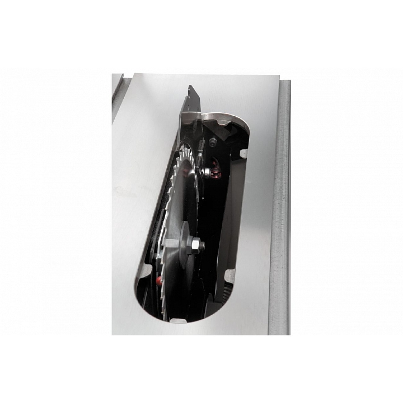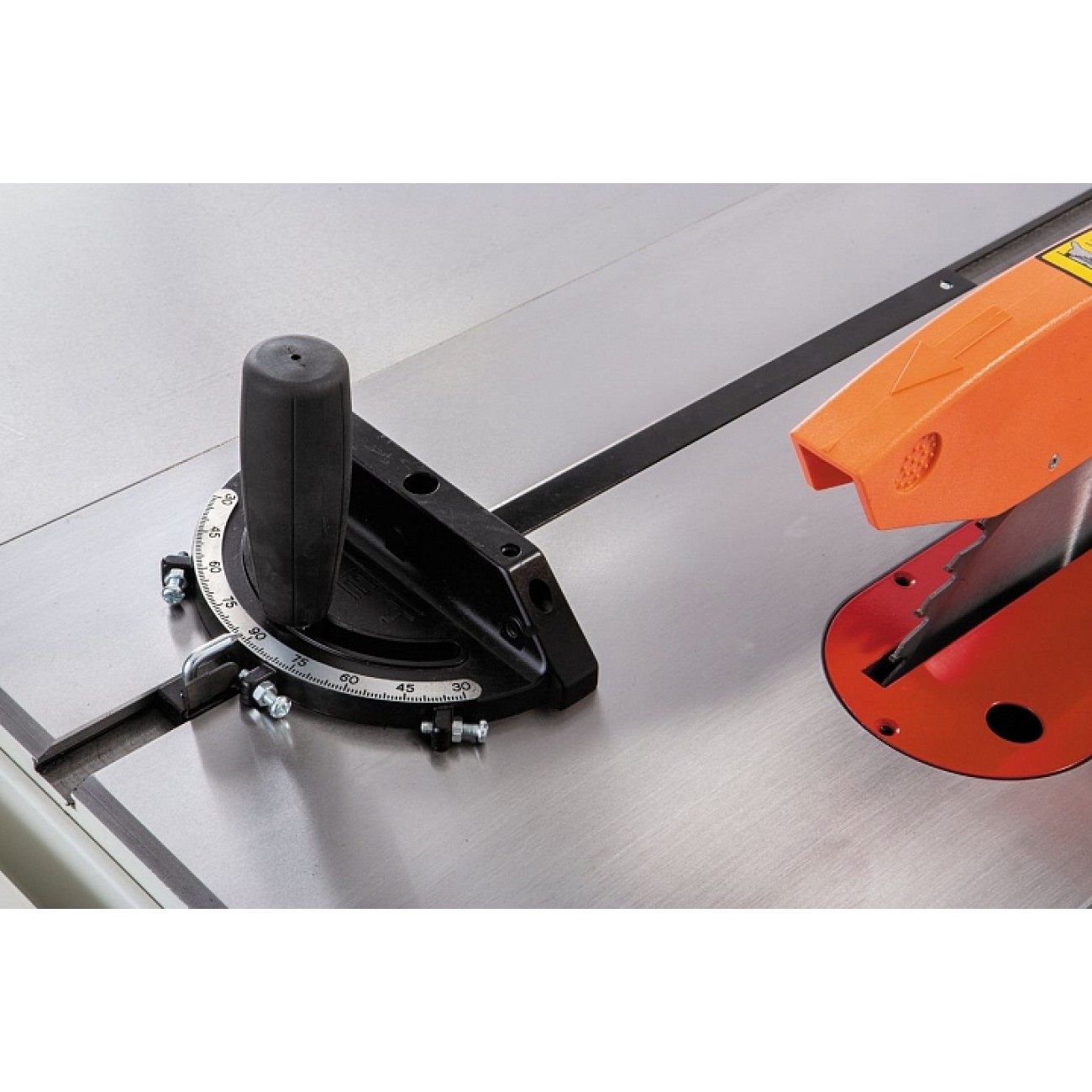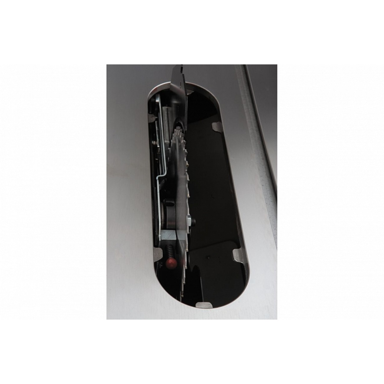 Поскольку пила не ориентирована на эксплуатацию с кареткой (такова особенность американской столярной практики), основное внимание уделено работе с параллельным упором. Его жесткая конструкция обеспечивает распиловку с точностью до 0,15 мм по длине заготовки, даже, несмотря на, одностороннюю фиксацию. Благодаря фторопластовым накладкам с двух сторон обеспечена высокая долговечность, легкость скольжения и отсутствие на заготовке черных следов от алюминия. Опционально упор можно оснастить системой отображения ширины распила на ЖК-индикаторе. В процессе эксплуатации может возникнуть необходимость юстировки параллельности диску, для этого предусмотрены регулировочные винты.
