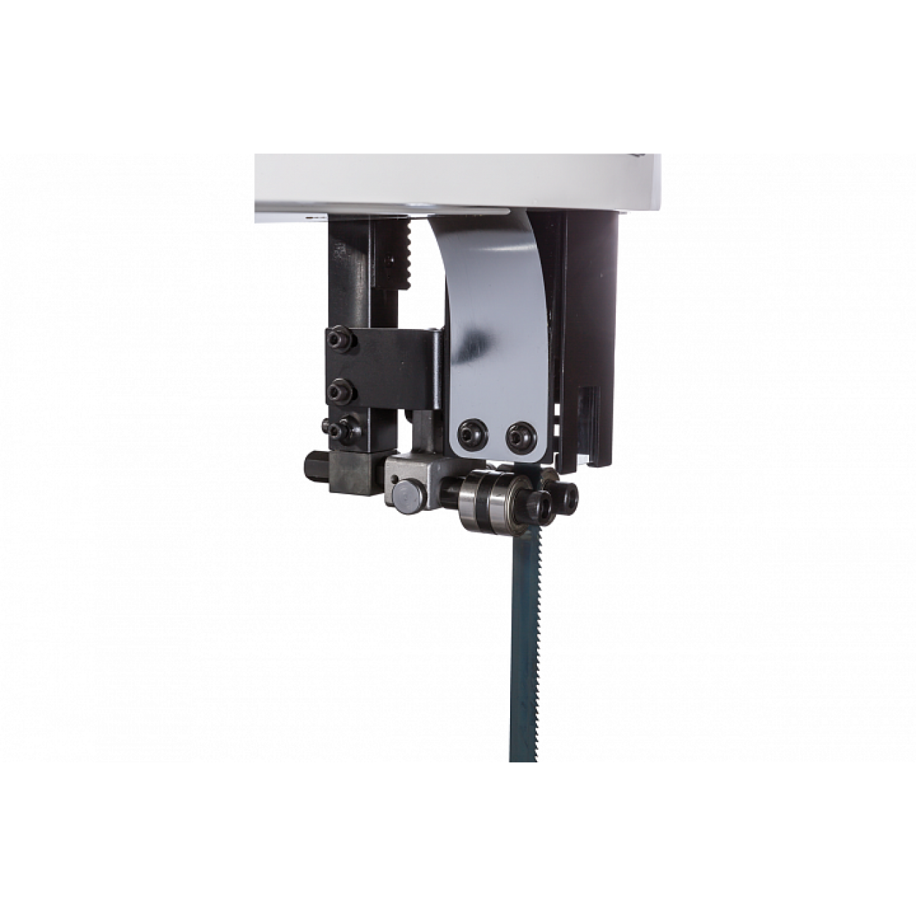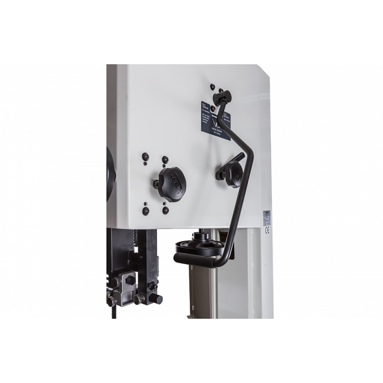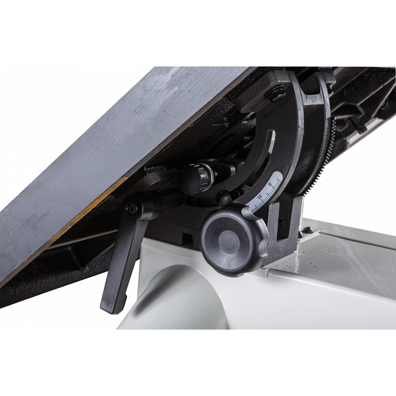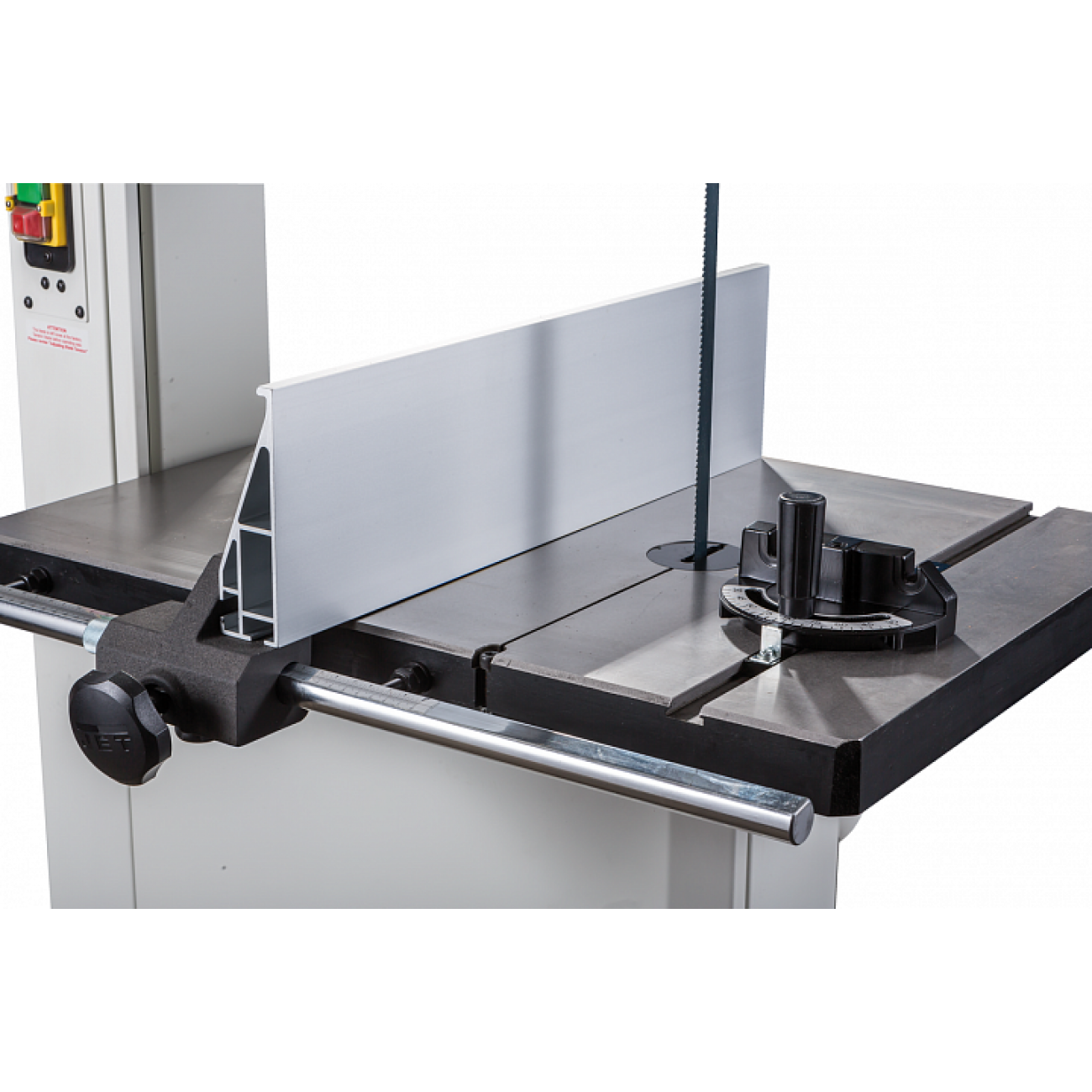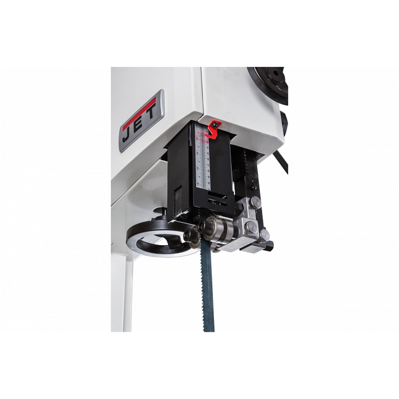 Jet JWBS-18 – новая ленточная пила для профессионального применения. Ее основное преимущество на фоне аналогов прошлых поколений – увеличенная высота распиловки. Этот параметр очень важен для тех, кому нужен универсальный станок, способный взять на себя функции делительного. К подобным работам приспособлен и параллельный упор: направляющий профиль можно установить вертикально на боковую грань так, чтобы надежно фиксировать плоские заготовки при их роспуске на тонкие пластины. В целом конструкция бокового упора очень хорошо проработана и соответствует самым строгим требованиям: профиль жесткий и прочный, закреплен на массивном чугунном кронштейне, который перемещается по цилиндрической направляющей. Предусмотрена грубая (вручную) и точная (микрометрическим винтом) установка.