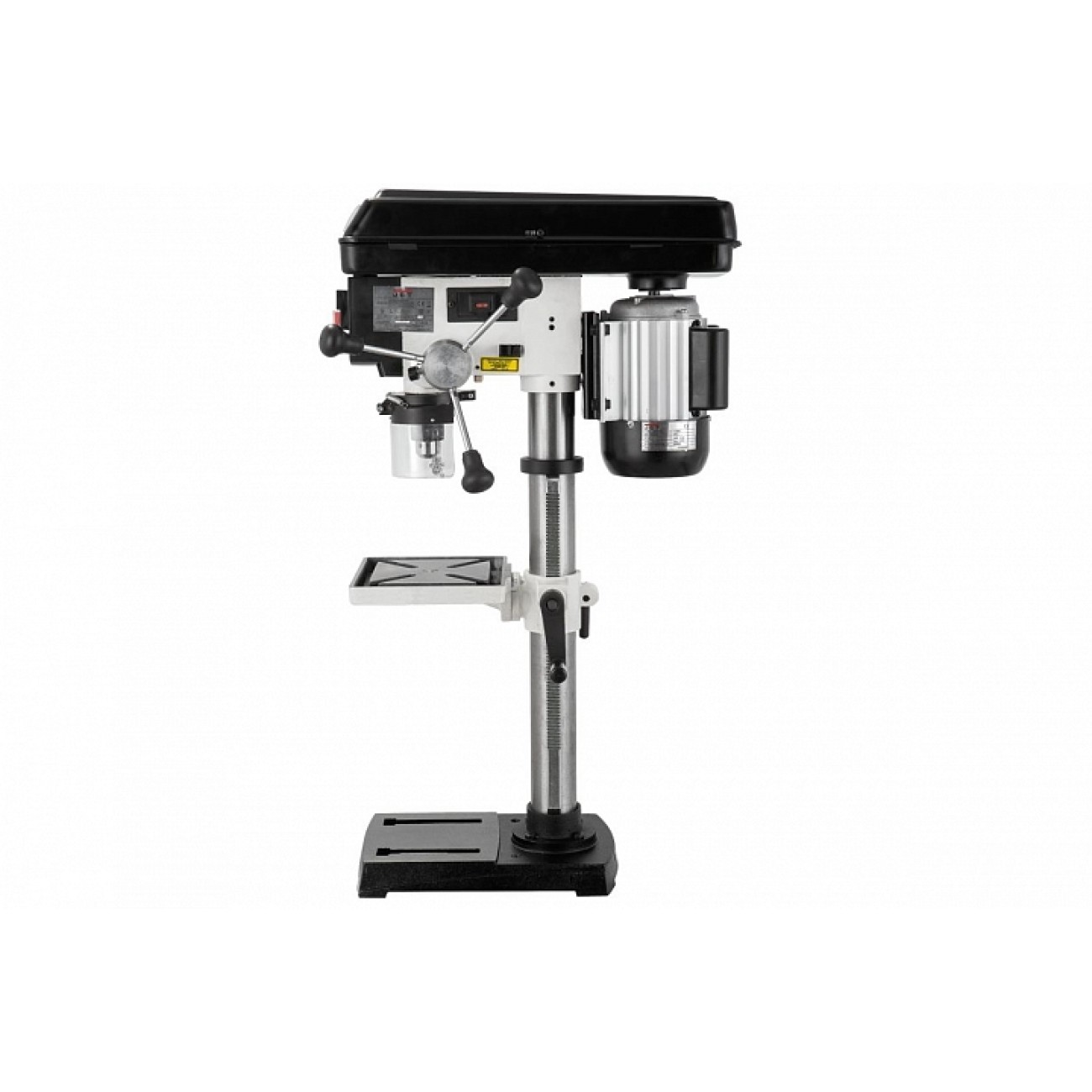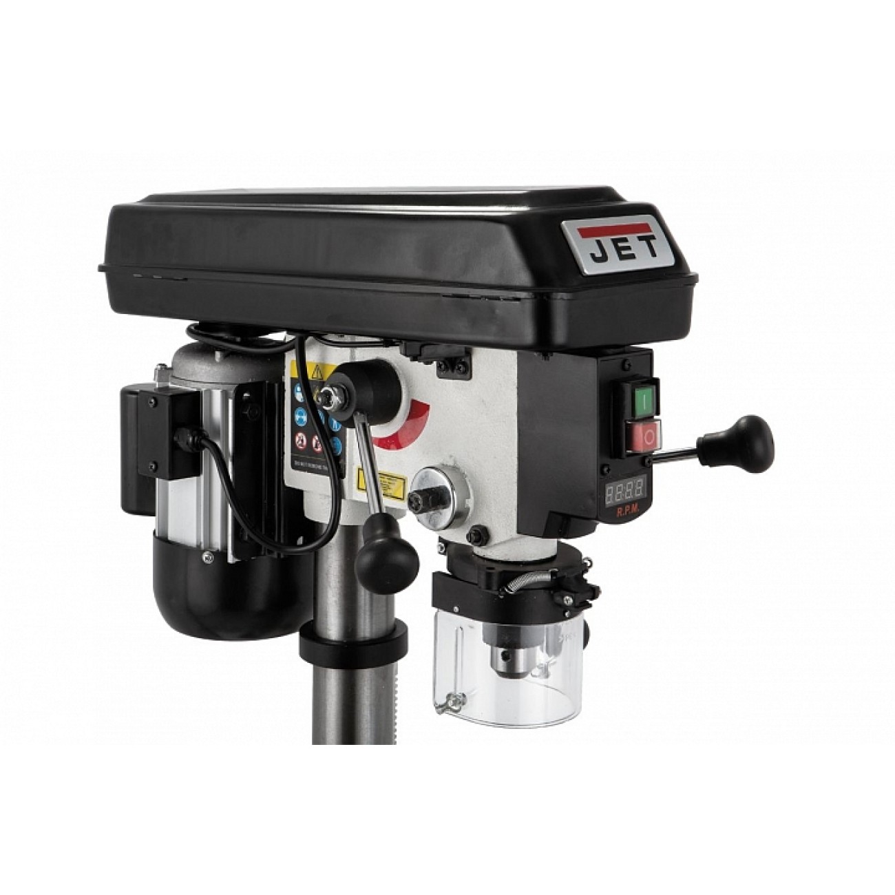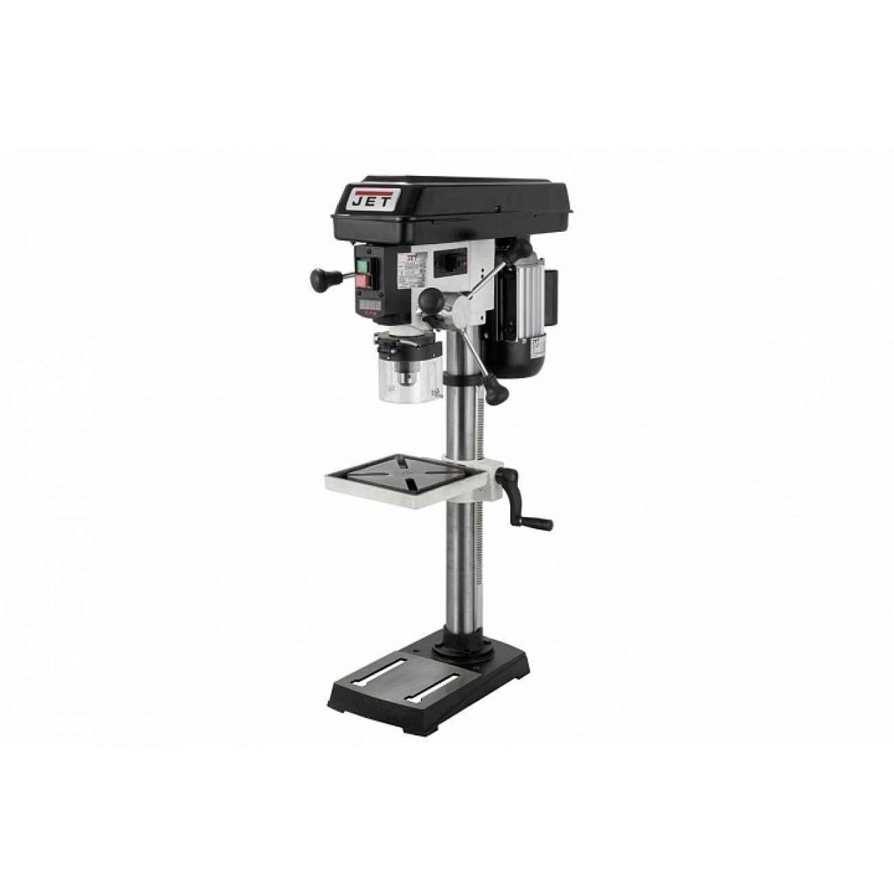 JWDP-10 это настольный сверлильный станок с вариатором для работы в небольших мастерских с деревом, металлом и другими материалами. Его конструкция базируется на узлах и деталях профессиональной модели JWDP-12, но имеет ряд отличий: уменьшены общие размеры, изменено устройство стола, использован ключевой патрон и т.п. Эти меры позволили снизить стоимость при сохранении основных достоинств: частота вращения шпинделя меняется простым перемещением рычага управления, установленная скорость отображается на цифровом дисплее, штатная комплектация включает в себя лазерный указатель оси сверления, рабочий стол имеет Т-образные пазы для крепления тисков и прихватов, предусмотрена работа от основания.