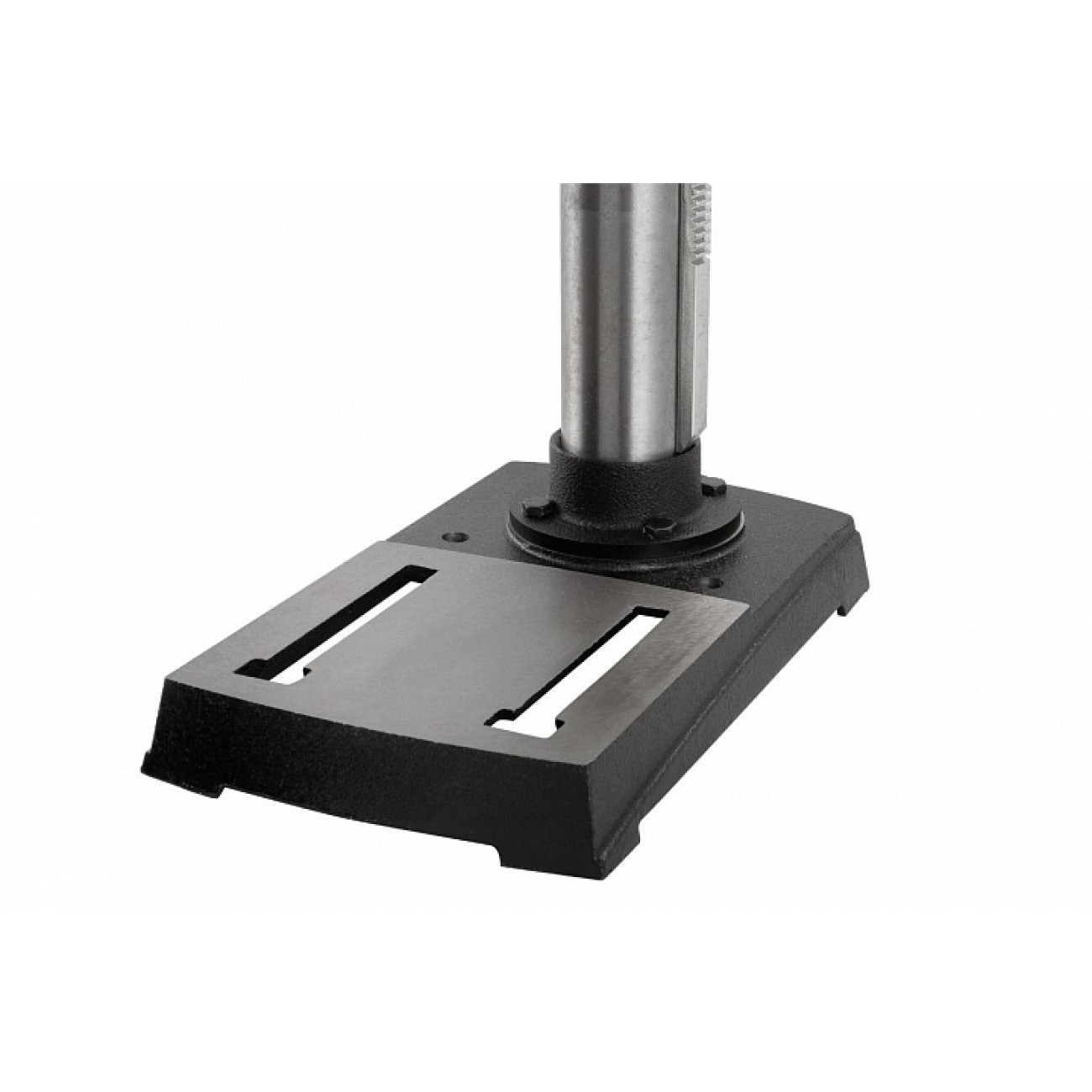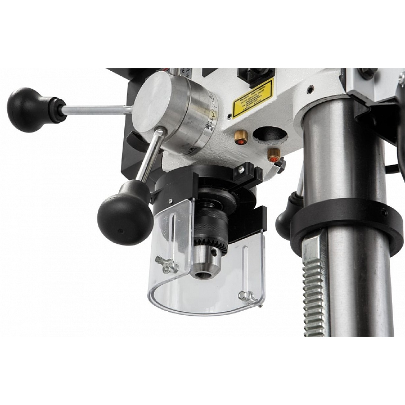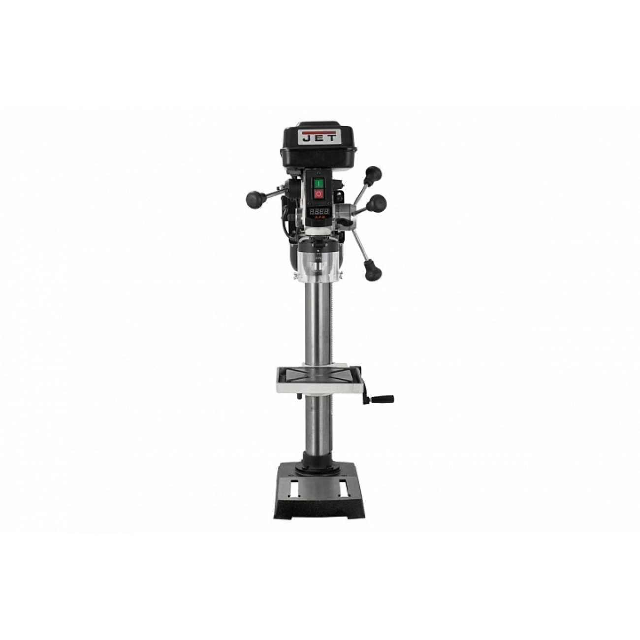 JWDP-10 это настольный сверлильный станок с вариатором для работы в небольших мастерских с деревом, металлом и другими материалами. Его конструкция базируется на узлах и деталях профессиональной модели JWDP-12, но имеет ряд отличий: уменьшены общие размеры, изменено устройство стола, использован ключевой патрон и т.п. Эти меры позволили снизить стоимость при сохранении основных достоинств: частота вращения шпинделя меняется простым перемещением рычага управления, установленная скорость отображается на цифровом дисплее, штатная комплектация включает в себя лазерный указатель оси сверления, рабочий стол имеет Т-образные пазы для крепления тисков и прихватов, предусмотрена работа от основания.