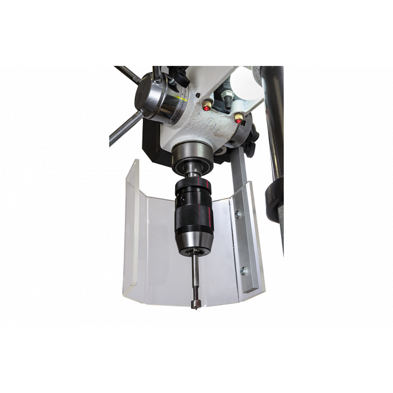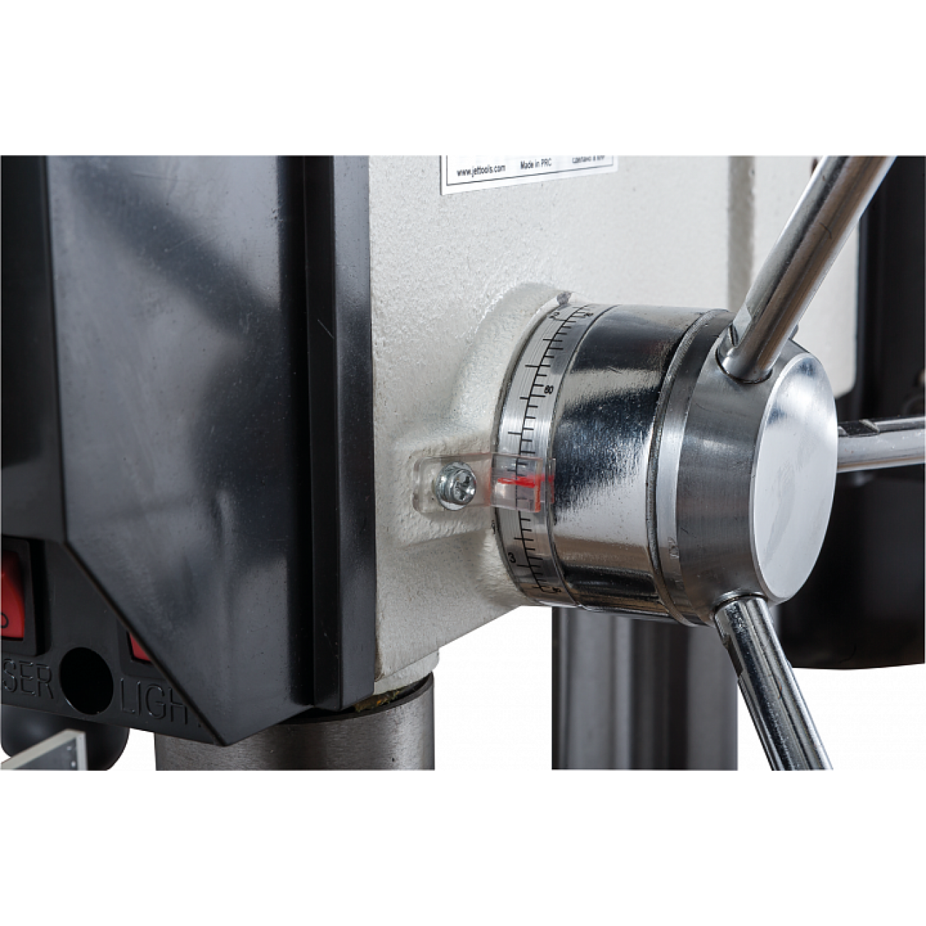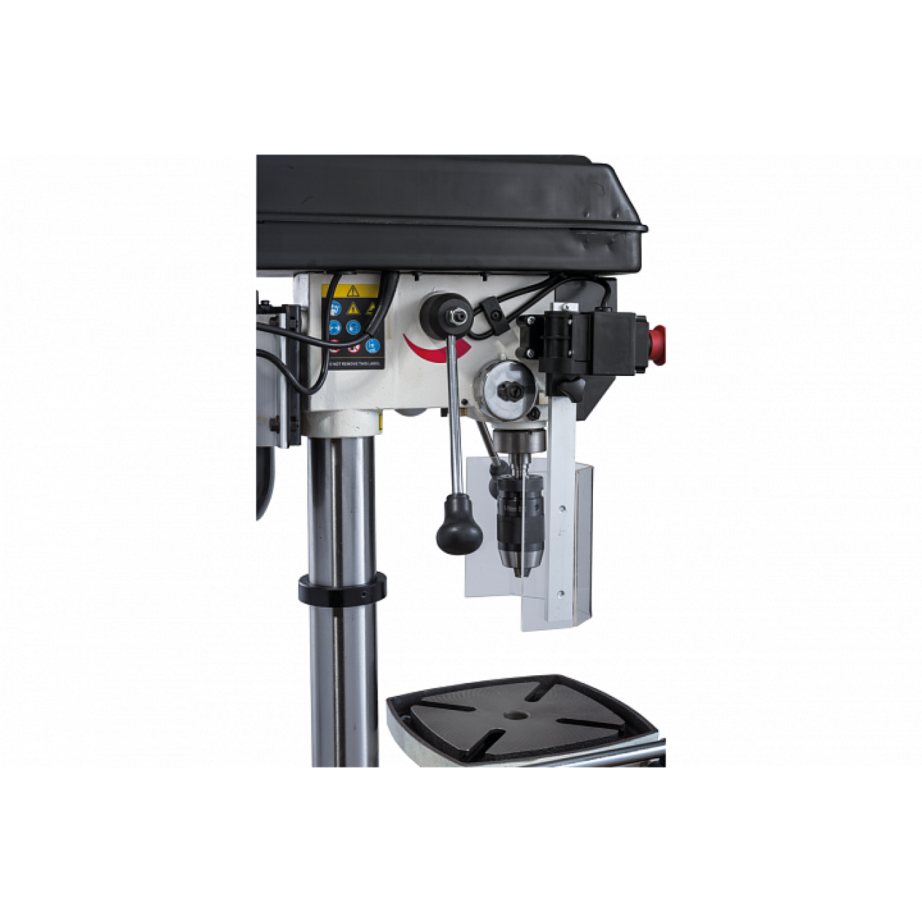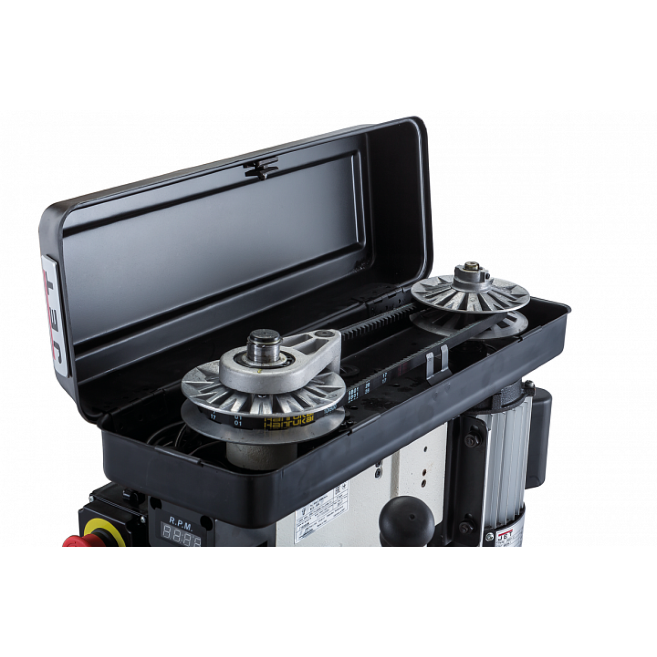 JWDP-12 — настольный сверлильный станок профессионального класса, подходящий для универсального (дерево и металл) применения. Основная отличительная черта этой модели – клиноременный вариатор, позволяющий плавно бесступенчато изменять скорость вращения шпинделя. Такая конструкция механизма ускоряет настройку в зависимости от диаметра сверления: вместо снятия и последующей установки ремня достаточно перевести рычаг, причем делают это, не выключая мотор. При этом фактическая скорость вращения шпинделя будет отображаться на цифровом дисплее, что особенно важно при работе с металлом, когда ограничения по частоте вращения режущего инструмента гораздо более строгие, чем при работе с деревом.