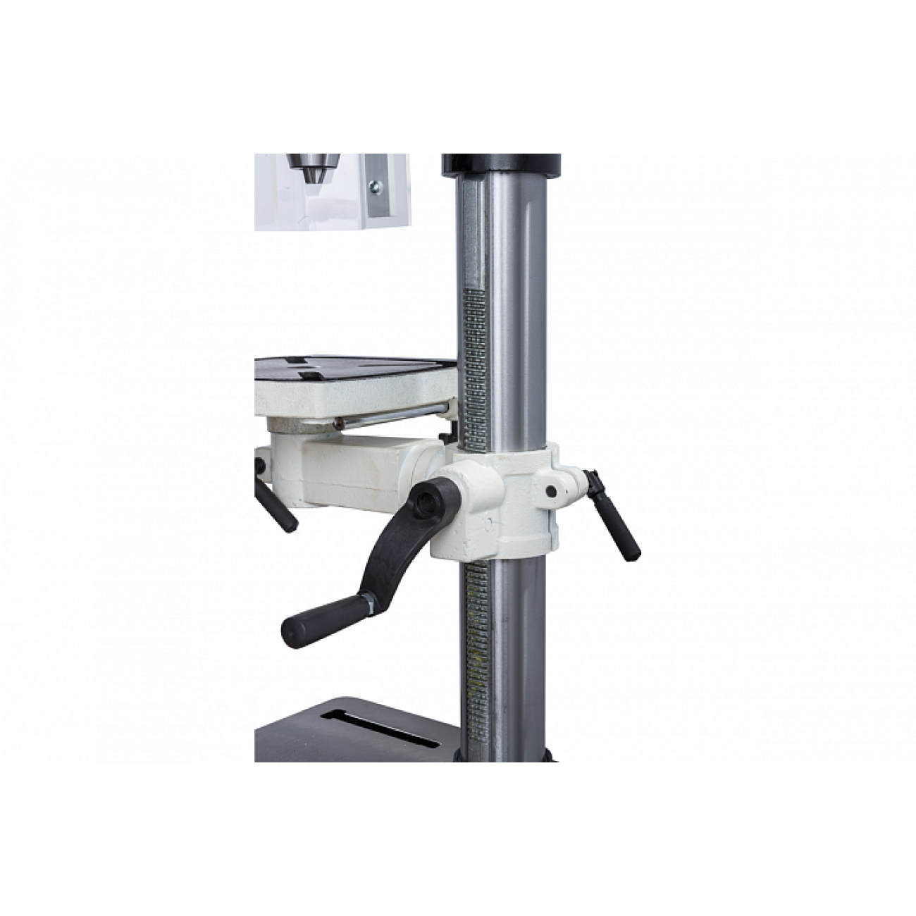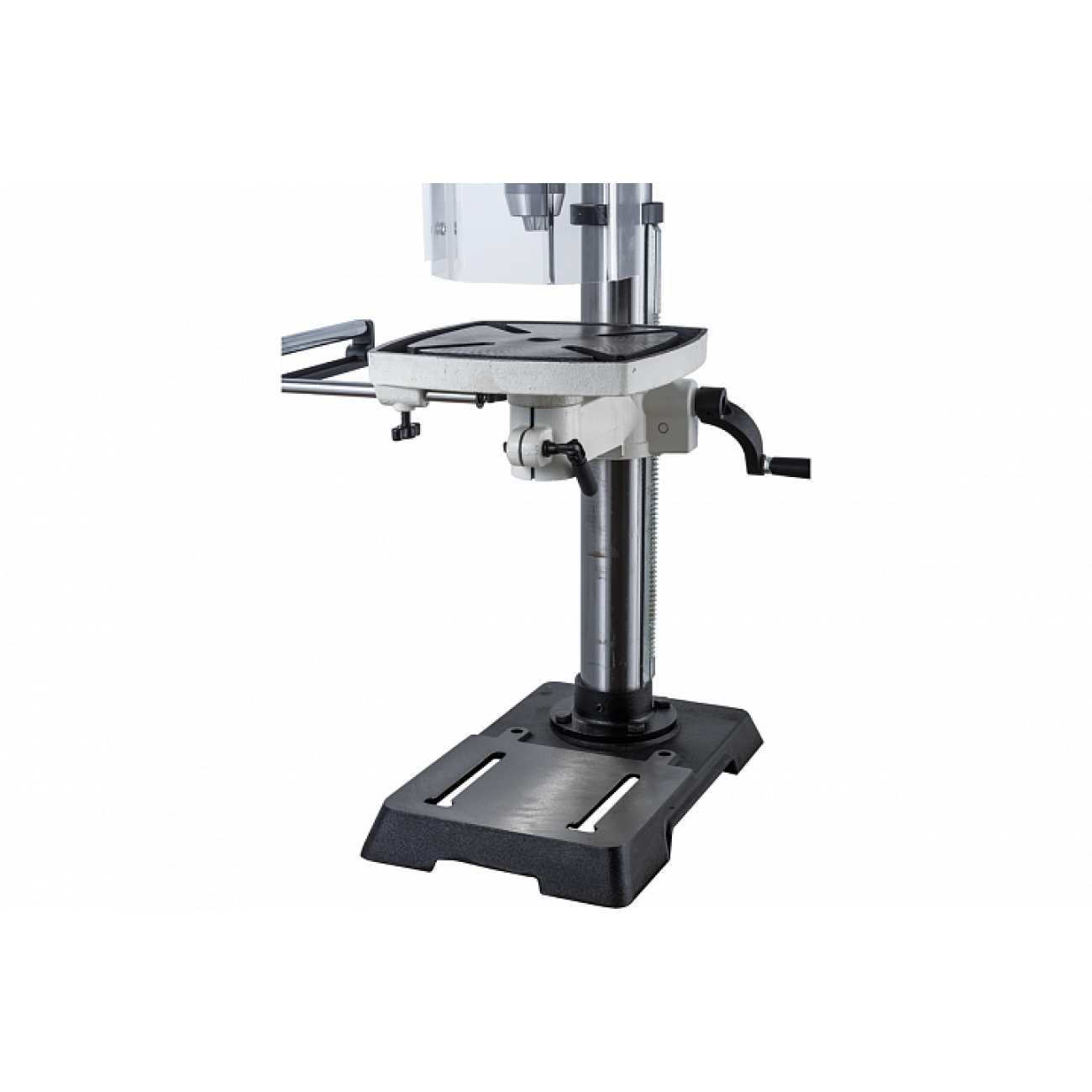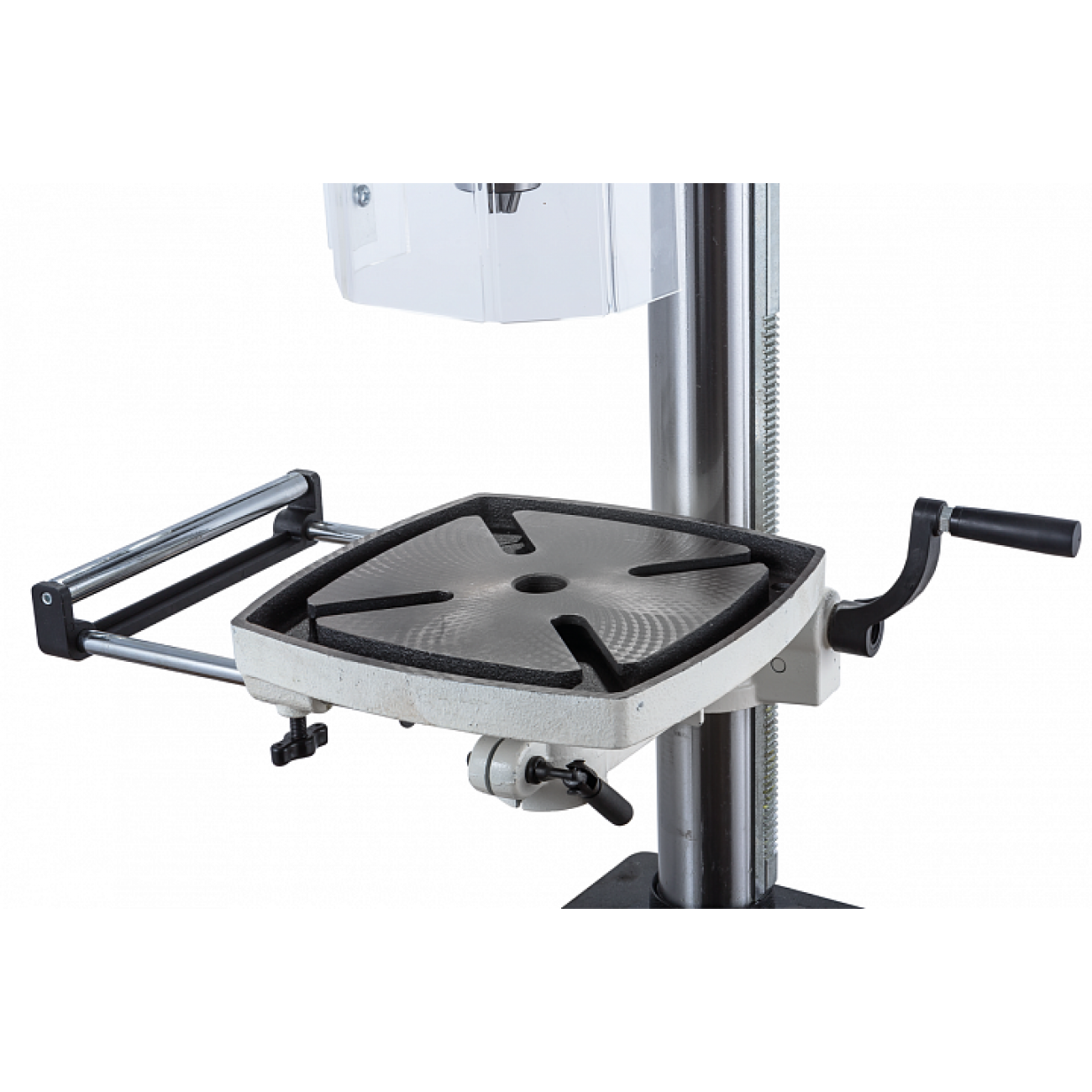 Станок оборудован массивным чугунным столом, имеющим Т-образные пазы для крепления тисков. Стол установлен на литом кронштейне, поворачивается вокруг своей оси и наклоняется влево и вправо на угол до 45 градусов. Кронштейн перемещается вверх и вниз по колонне благодаря зубчато-реечному механизму с вращающейся рукояткой. Рабочая поверхность для установки тисков отфрезерована и на основании, что позволяет работать от него, предварительно сняв или отвернув в сторону стол.
