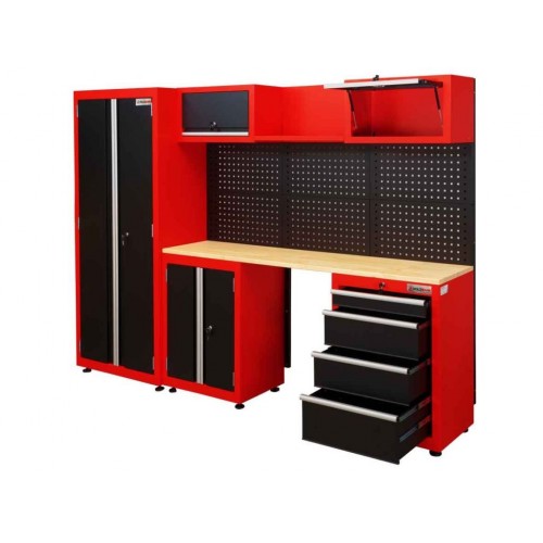 Стільниця виготовлена з каучукового дерева і має розмір 1830x406x25 мм. Висоту стільниці можна змінювати за допомогою регульованих ніжок. Підлогова шафа має 3 полиці, які можна знімати і встановлювати на потрібній висоті. 2 навісні шафи оснащені газовими пружинами для легкого відкривання і закривання. 2 нижні шафи, одна з 4 шухлядами і друга з 2 дверцятами, дозволяють зручно розмістити інструмент і дрібні аксесуари. Щоб все необхідне було завжди під рукою, є 6 навісних перфорованих модулів. Ця шафа верстак виготовлена з високоякісних матеріалів, що гарантує її довговічність.